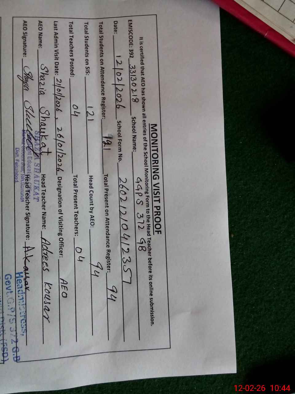 | Attendance Register | Head Teacher | MEA with School | Visit Proof |