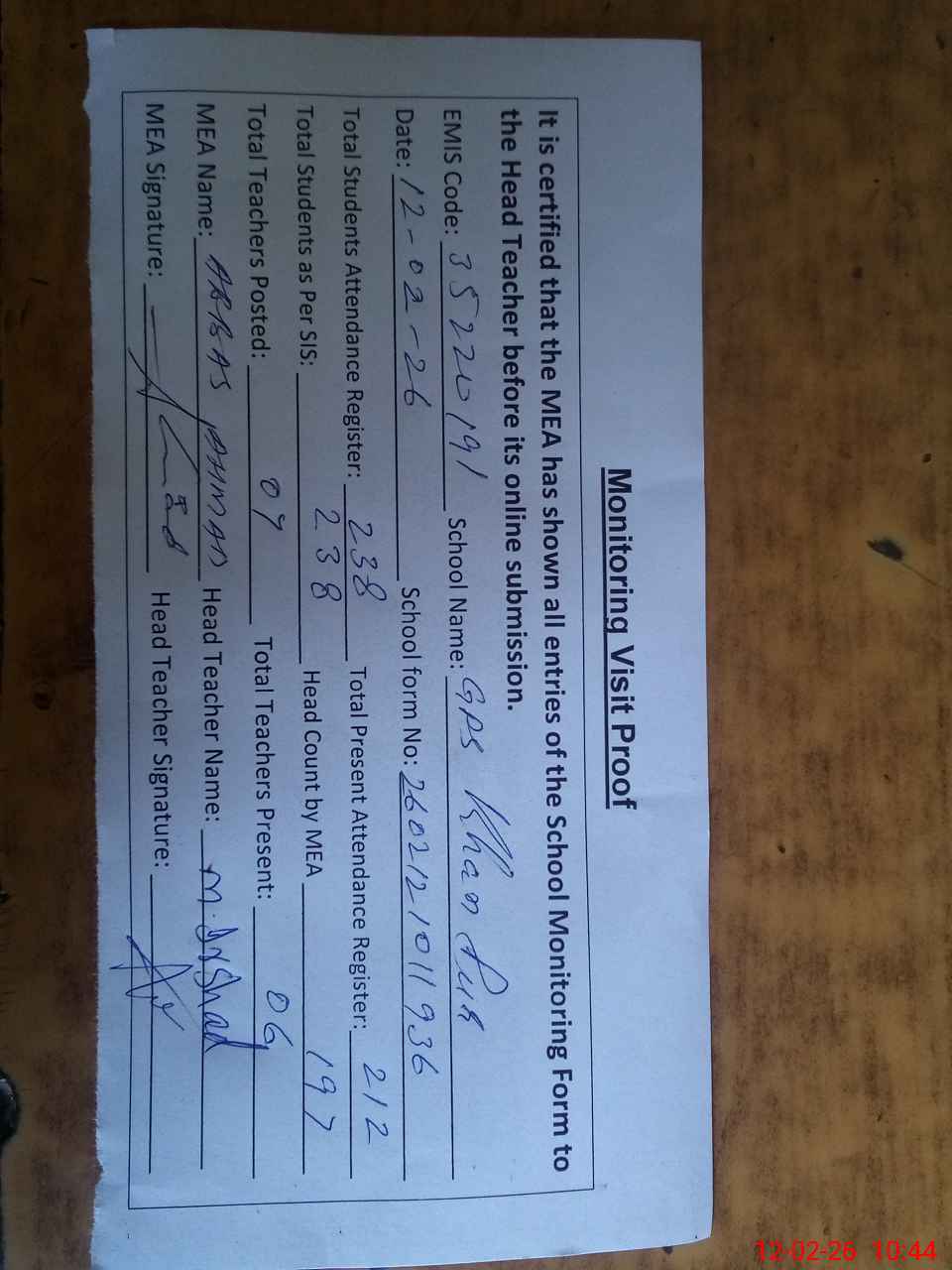 | Attendance Register | Head Teacher | MEA with School | Visit Proof |