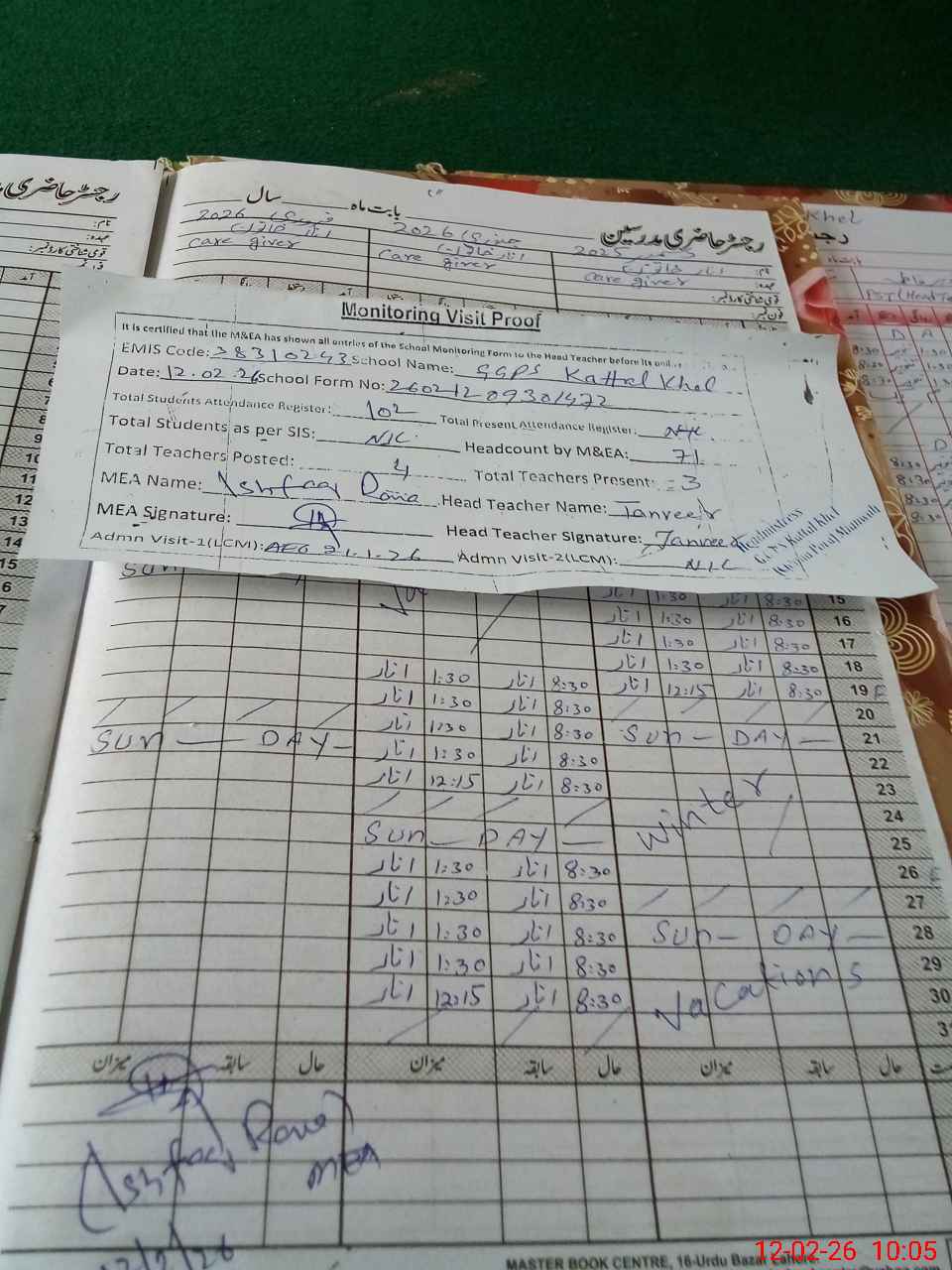 | Attendance Register | Head Teacher | MEA with School | Visit Proof |