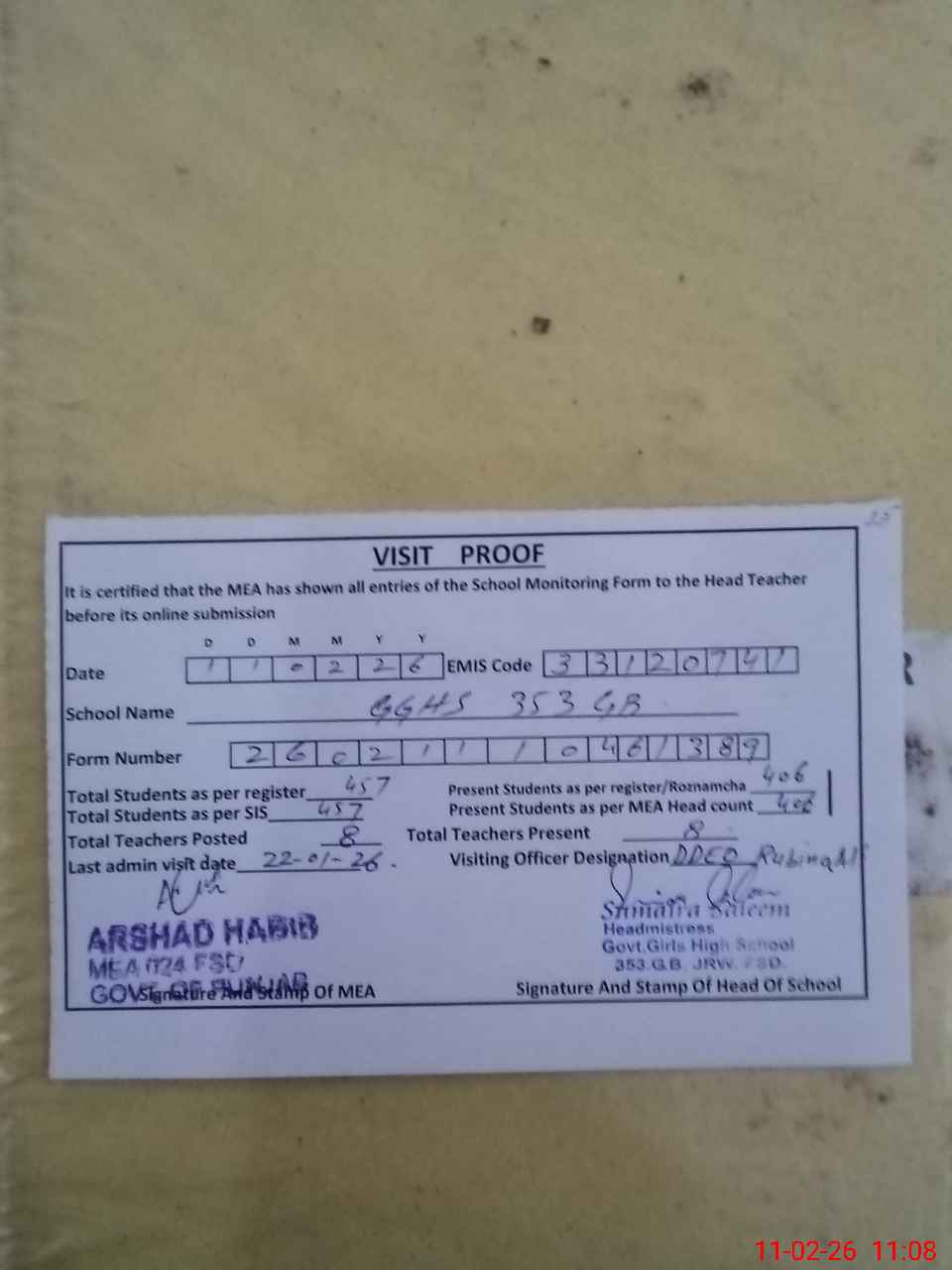 | Attendance Register | Head Teacher | MEA with School | Visit Proof |
