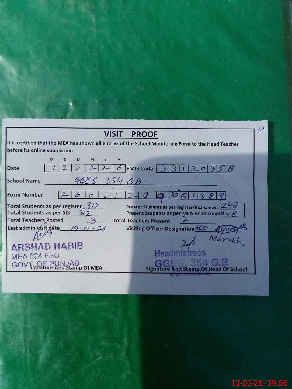 | EMIS Code: 33120358 | Name of School: GGES CHAK 354 GB JARANWALA | |||