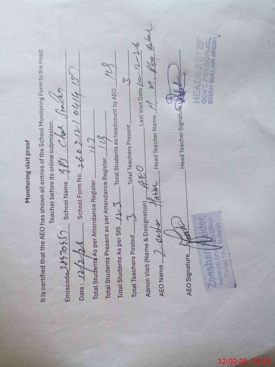 | Attendance Register | Head Teacher | MEA with School | Visit Proof |