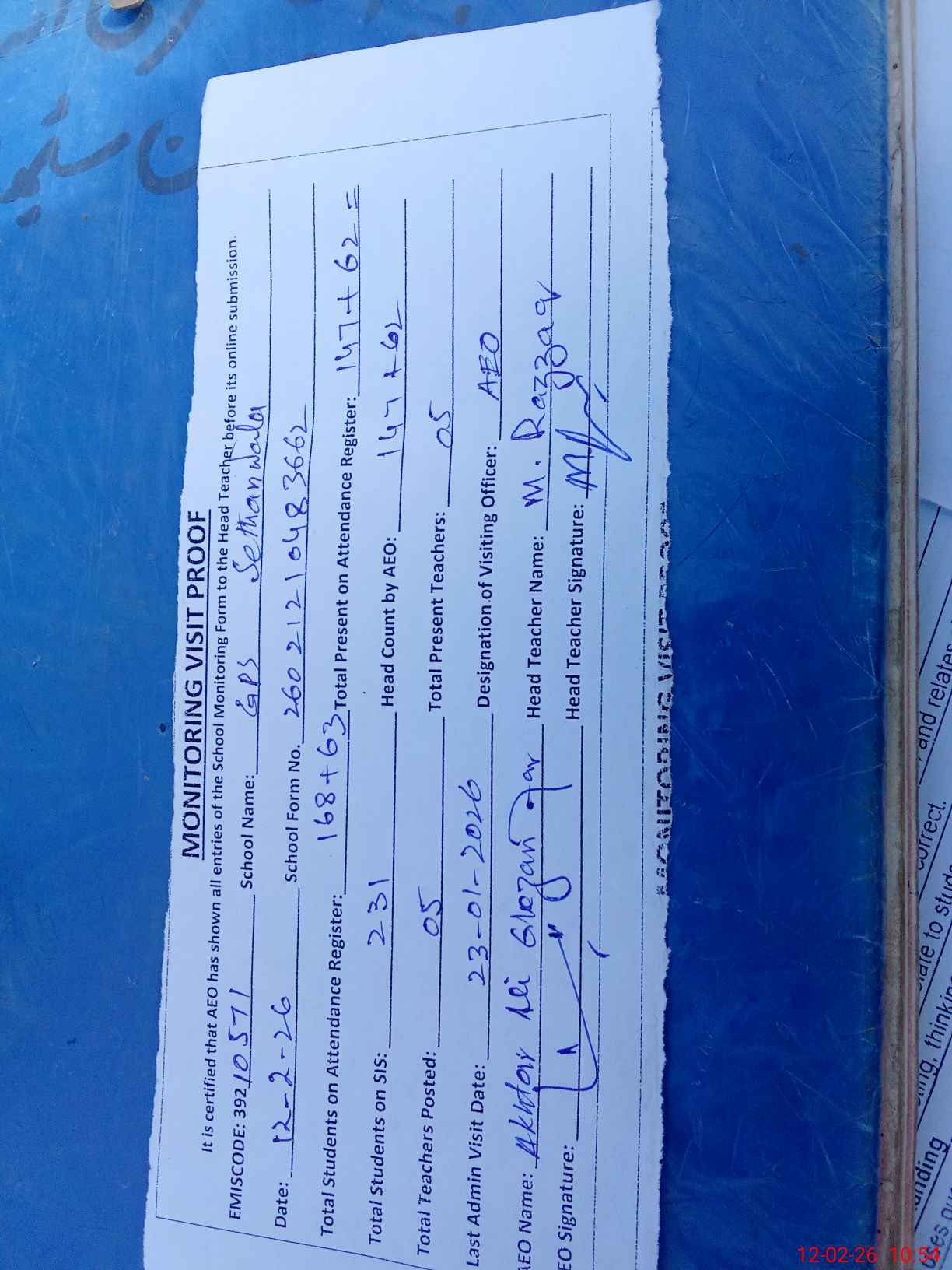 | Attendance Register | Head Teacher | MEA with School | Visit Proof |