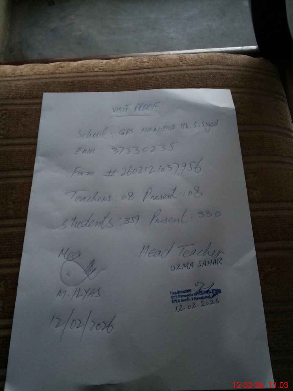 | EMIS Code: 37330235 | Name of School: GPS HAMIDIA KHAYABAN-E-SIR SYED | |||