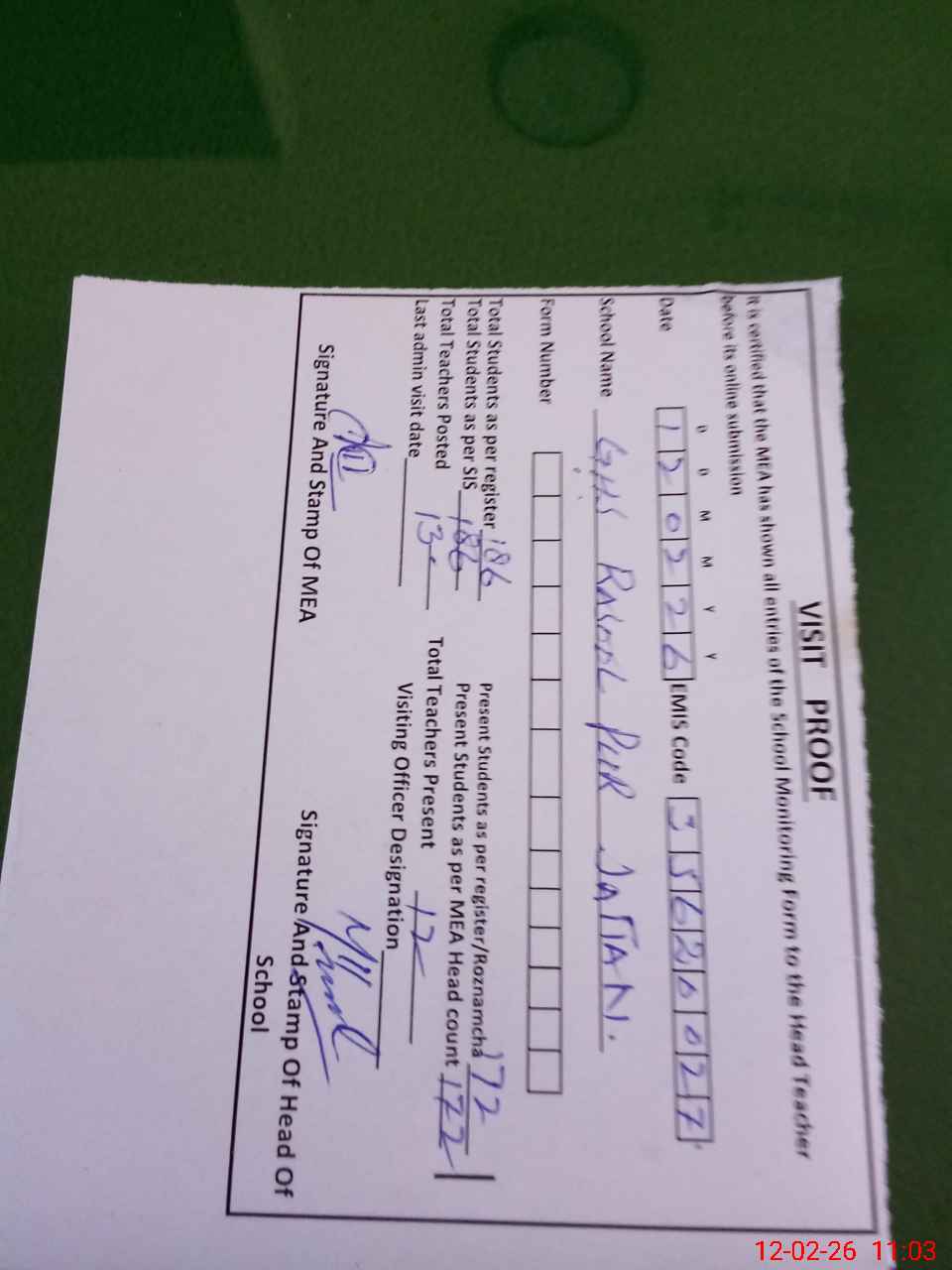 | Attendance Register | Head Teacher | MEA with School | Visit Proof |