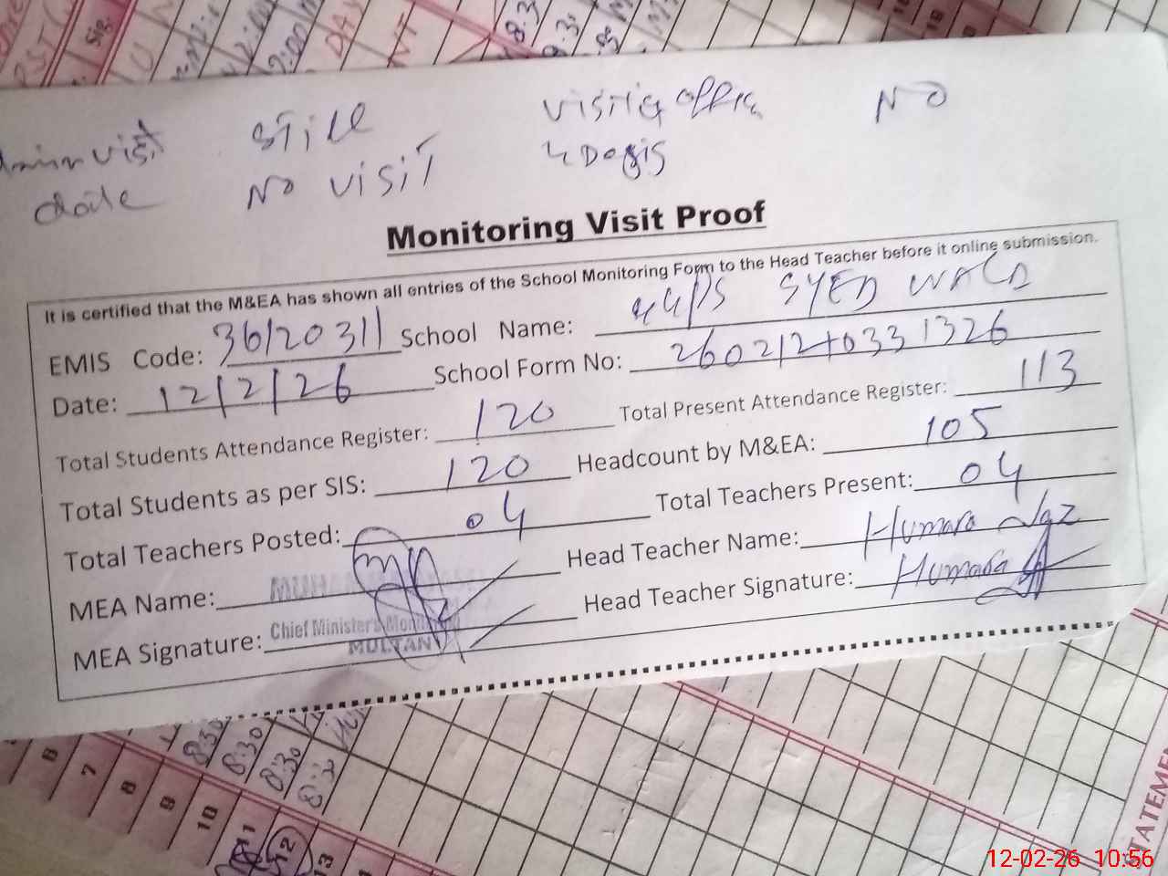 | Attendance Register | Head Teacher | MEA with School | Visit Proof |