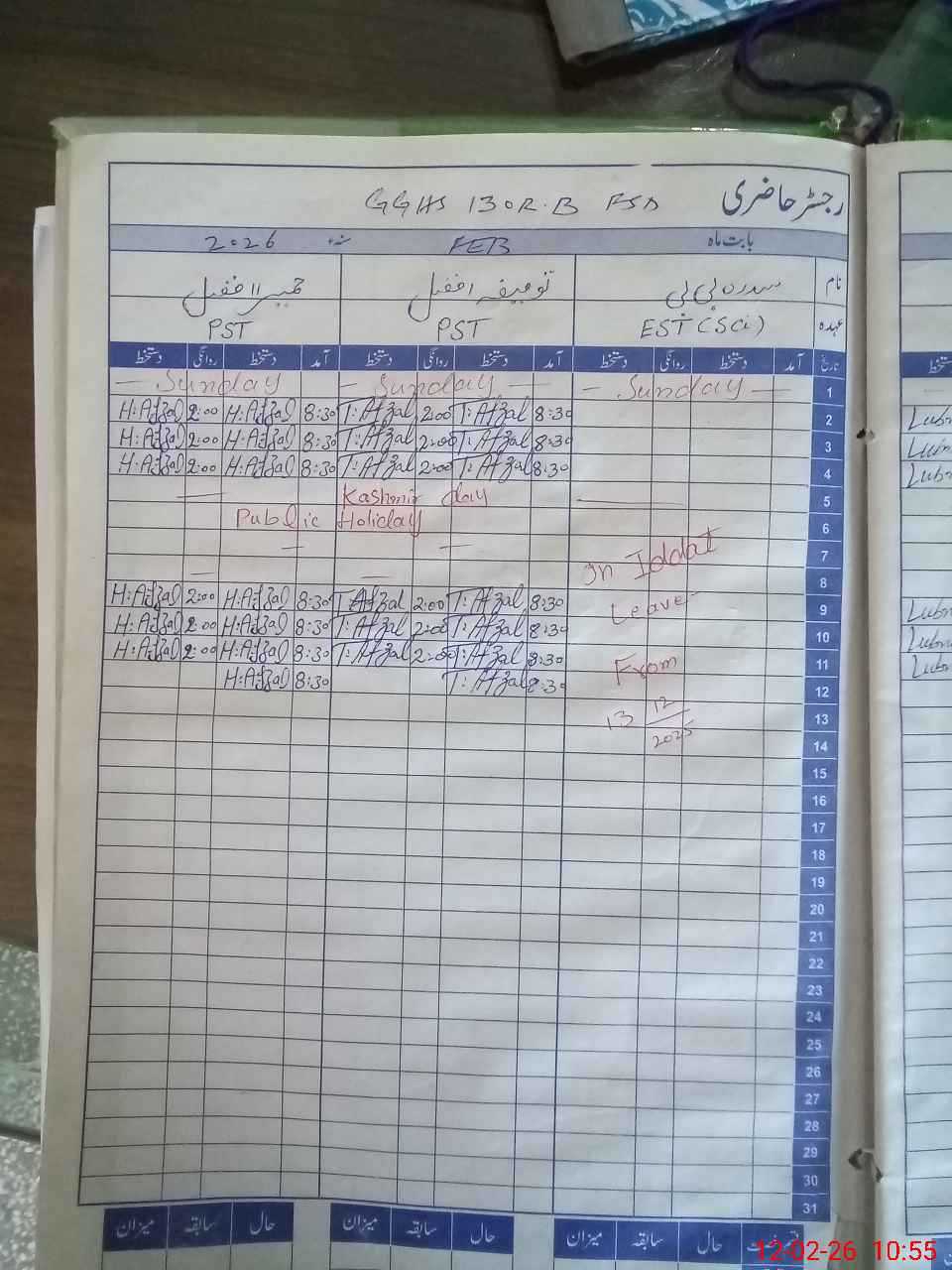 | CNIC | Full Name | Designation | R/C | Absence During Last Calender Month |
