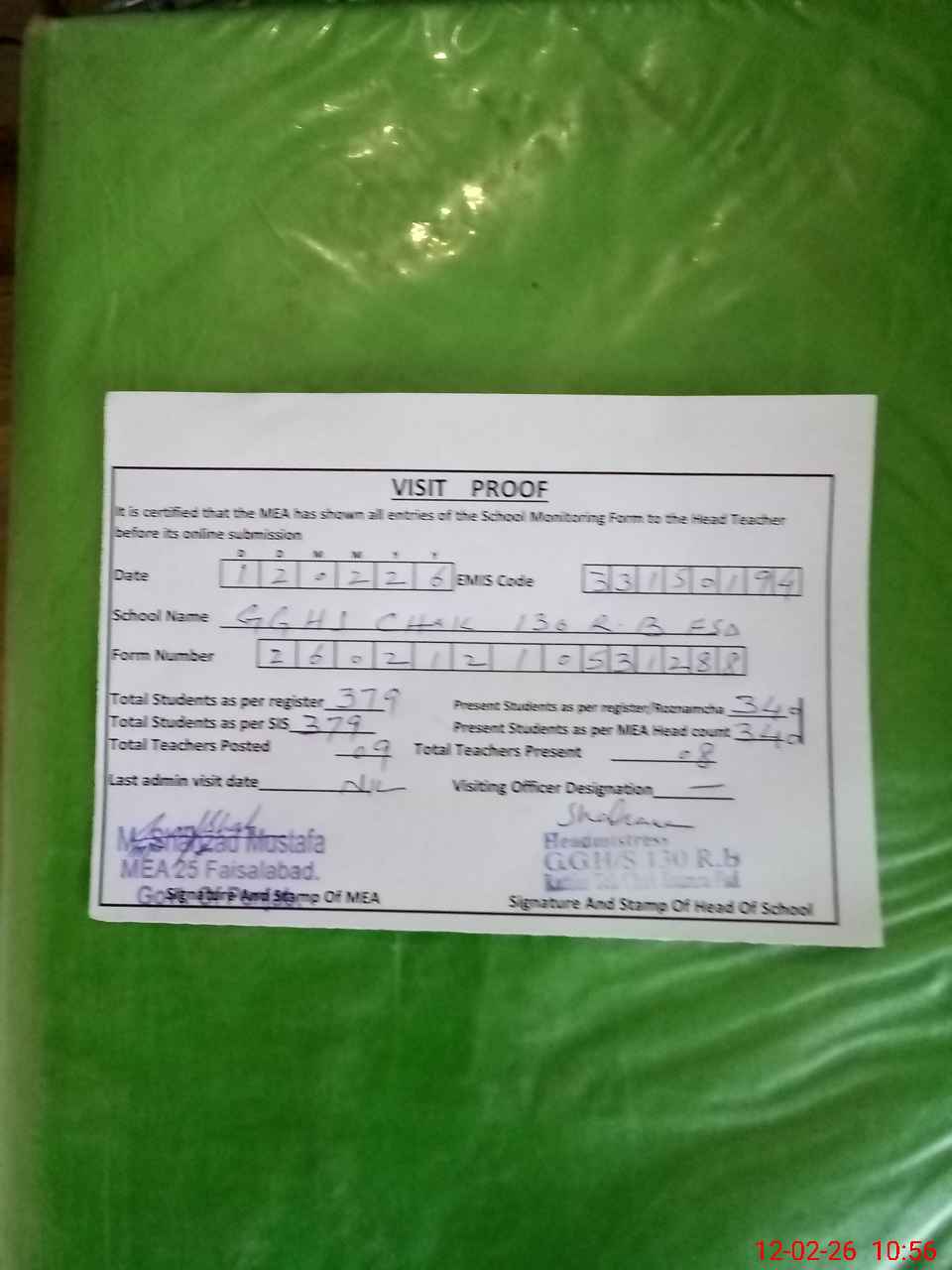 | Attendance Register | Head Teacher | MEA with School | Visit Proof |