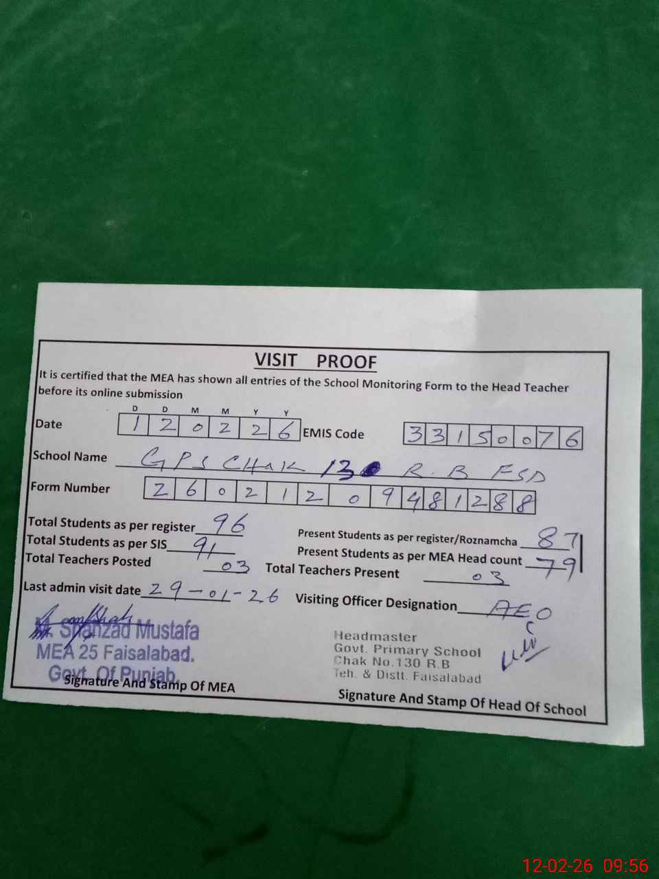 | Attendance Register | Head Teacher | MEA with School | Visit Proof |