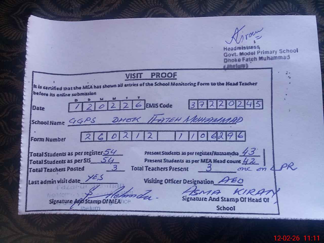 | Attendance Register | Head Teacher | MEA with School | Visit Proof |