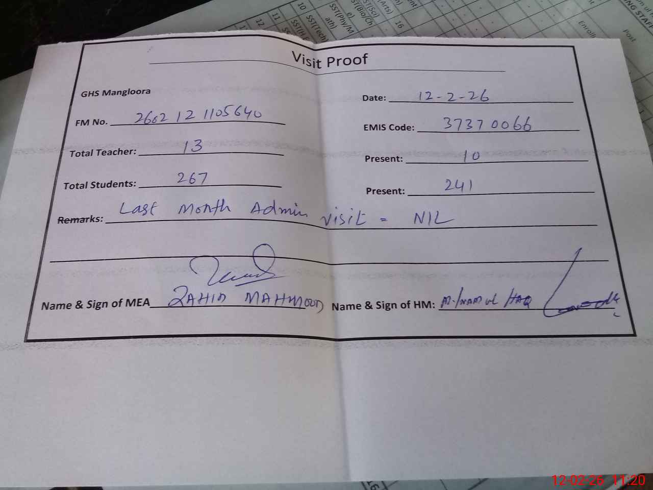 | Attendance Register | Head Teacher | MEA with School | Visit Proof |