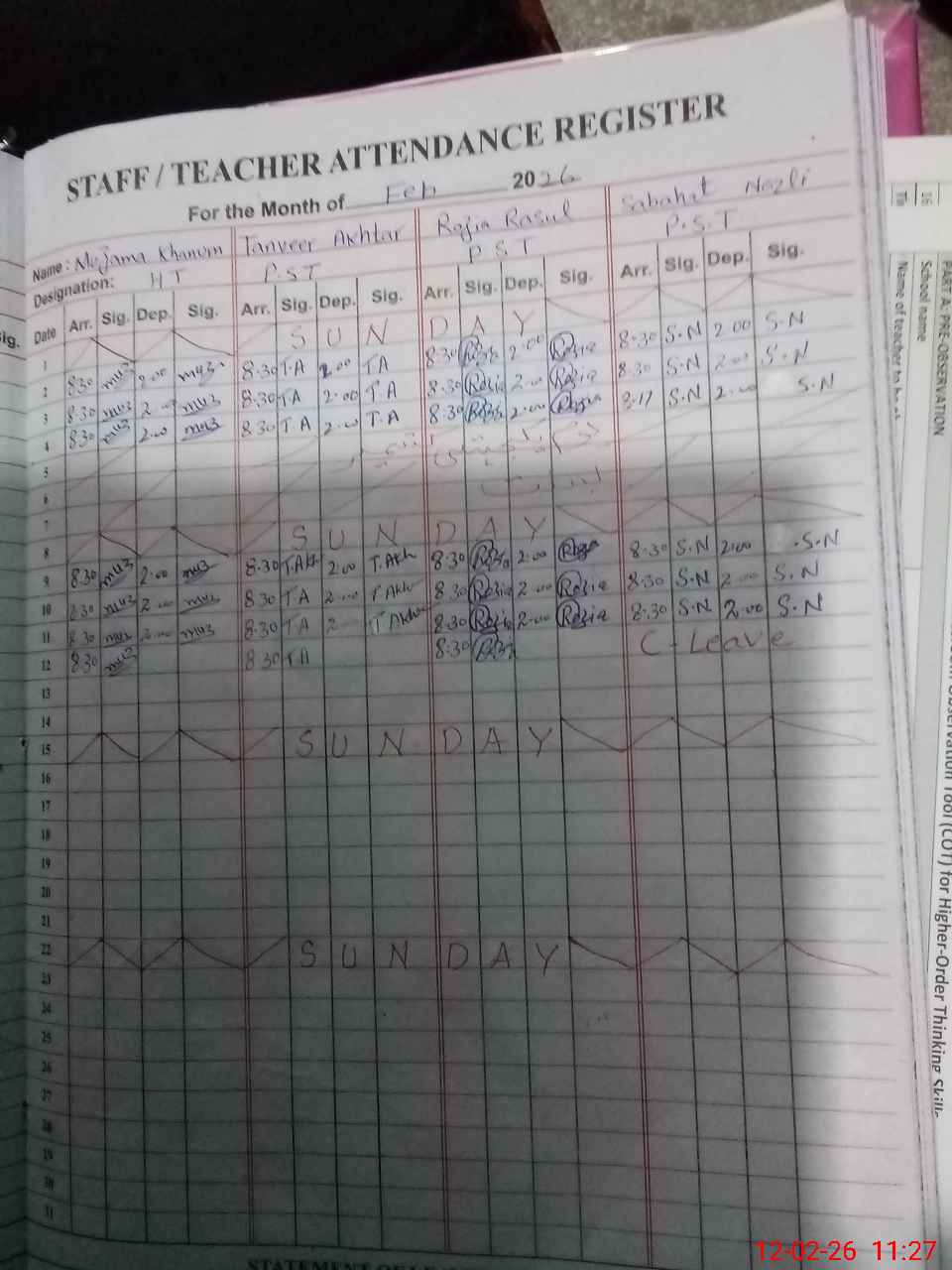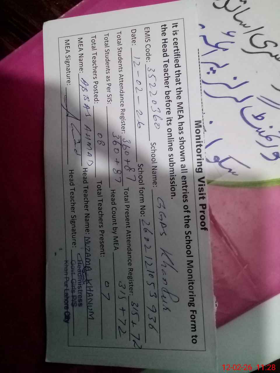 | Attendance Register | Head Teacher | MEA with School | Visit Proof |