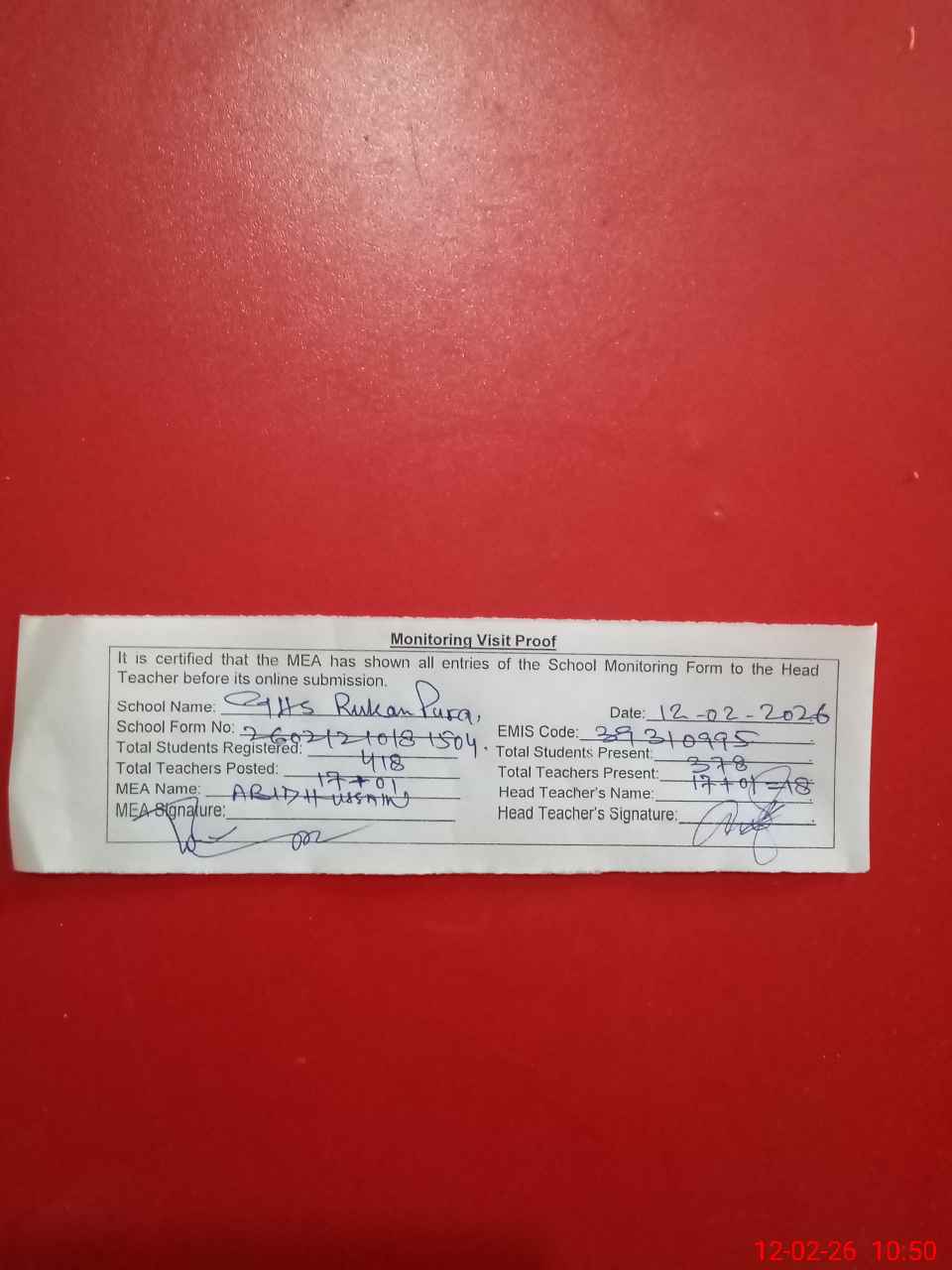 | Attendance Register | Head Teacher | MEA with School | Visit Proof |