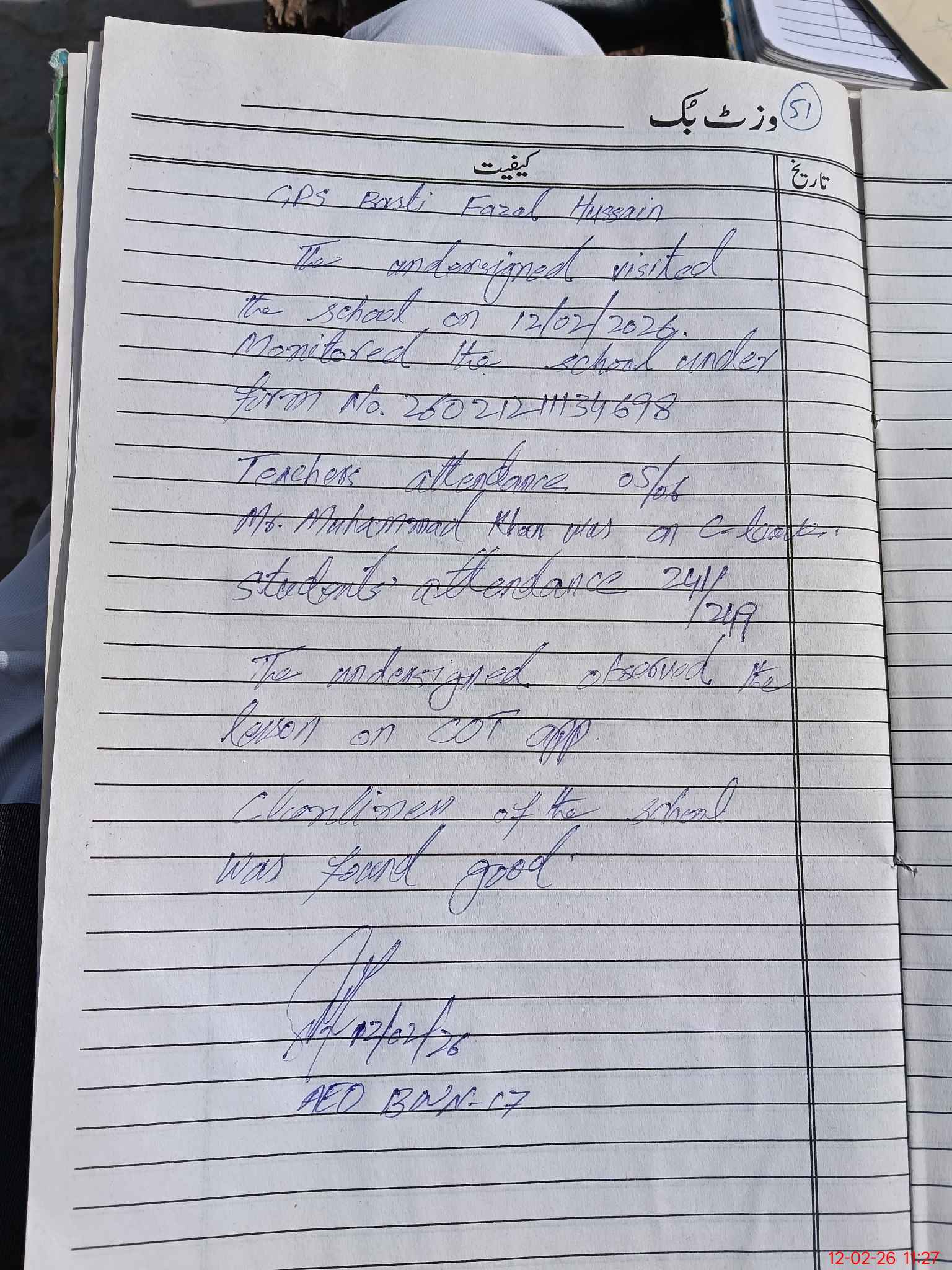 | Certified that this School was Inspected by the Undersigned MEA/DMO Today and the Information Stated Above is as Per Record. | |||||