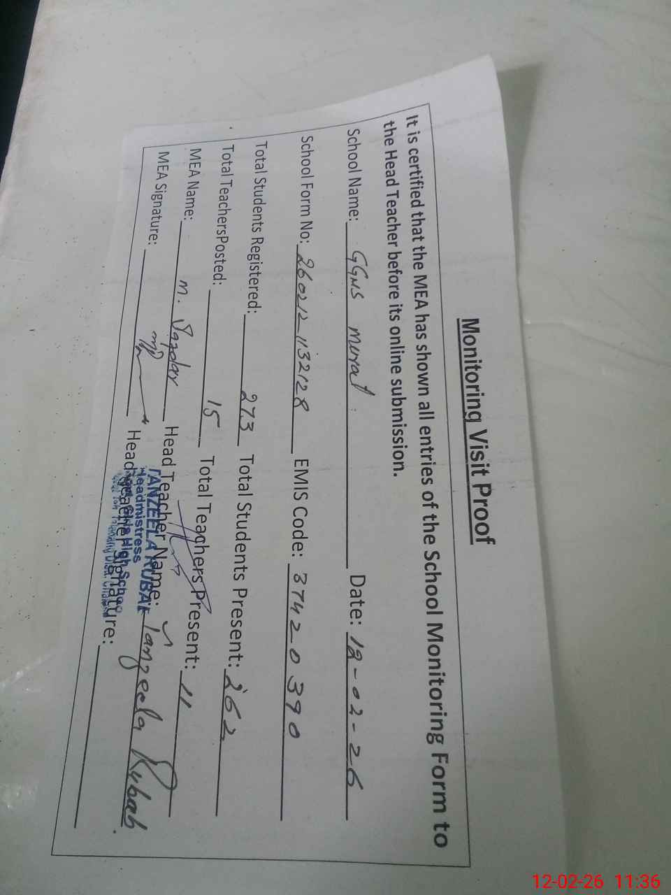 | Attendance Register | Head Teacher | MEA with School | Visit Proof |
