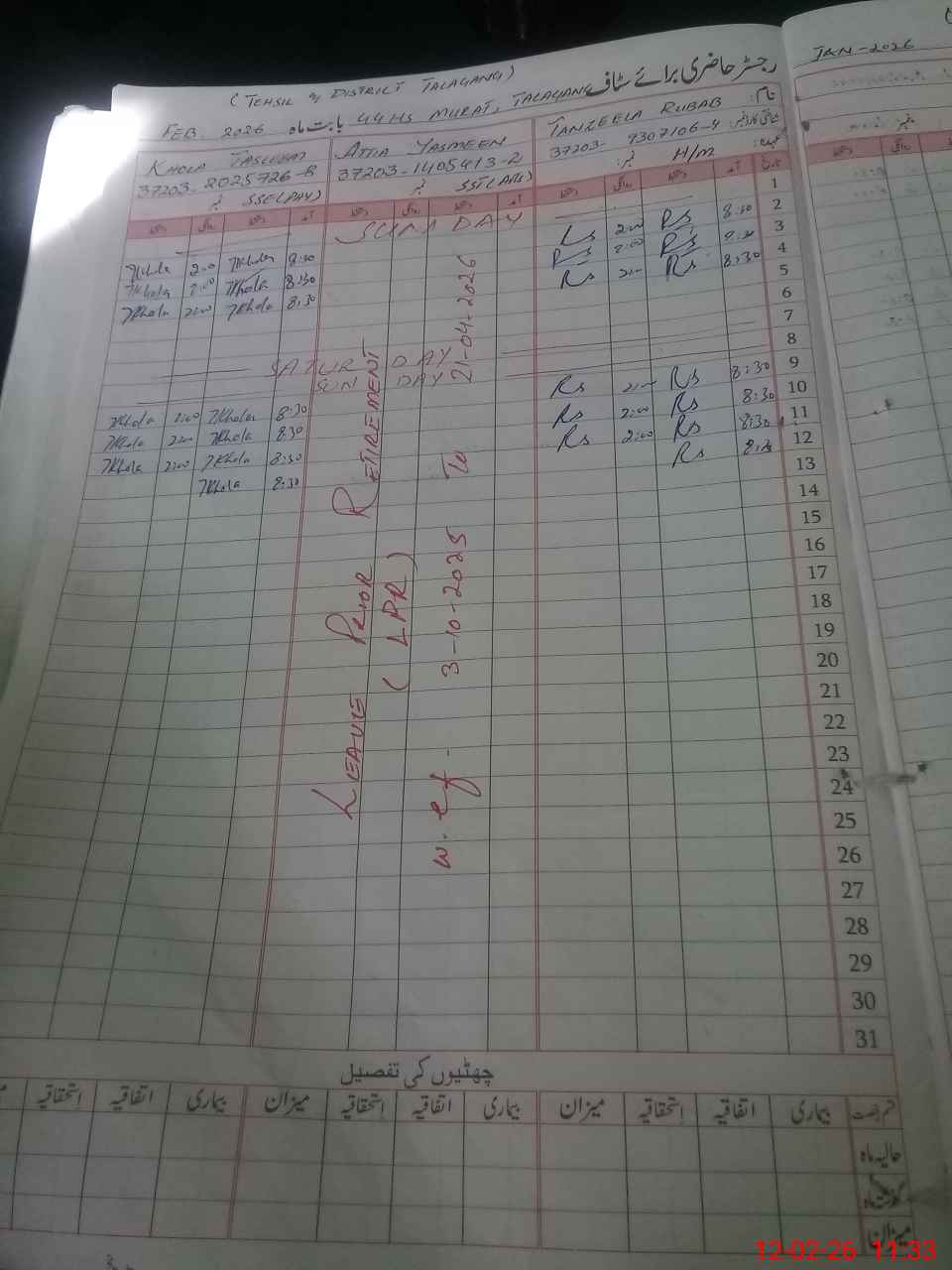 | CNIC | Full Name | Designation | R/C | Absence During Last Calender Month |