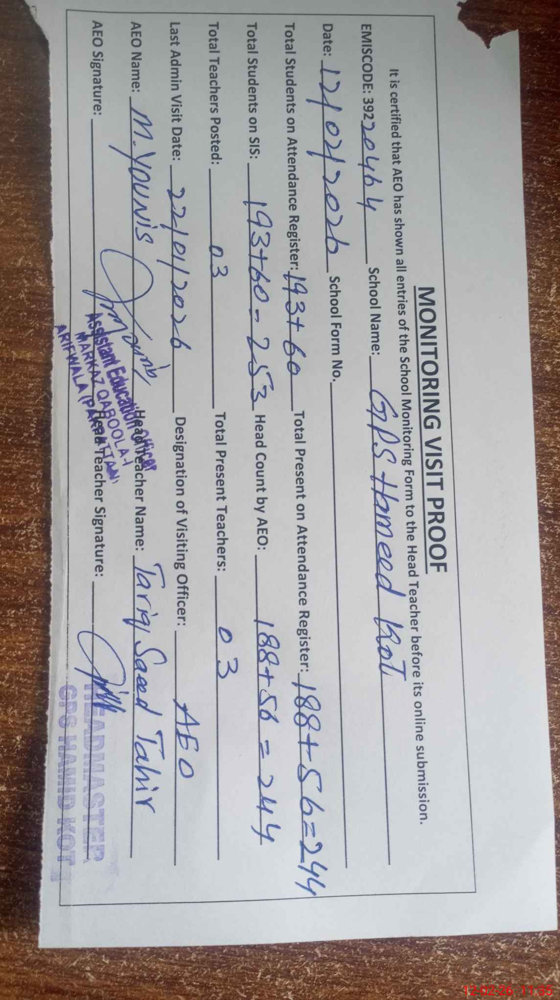 | EMIS Code: 39220464 | Name of School: GPS HAMEED KOT (MEHMOOD KOT) | |||