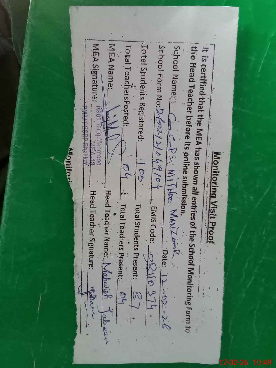 | EMIS Code: 38110374 | Name of School: GGPS MITHO MANZOOR | |||