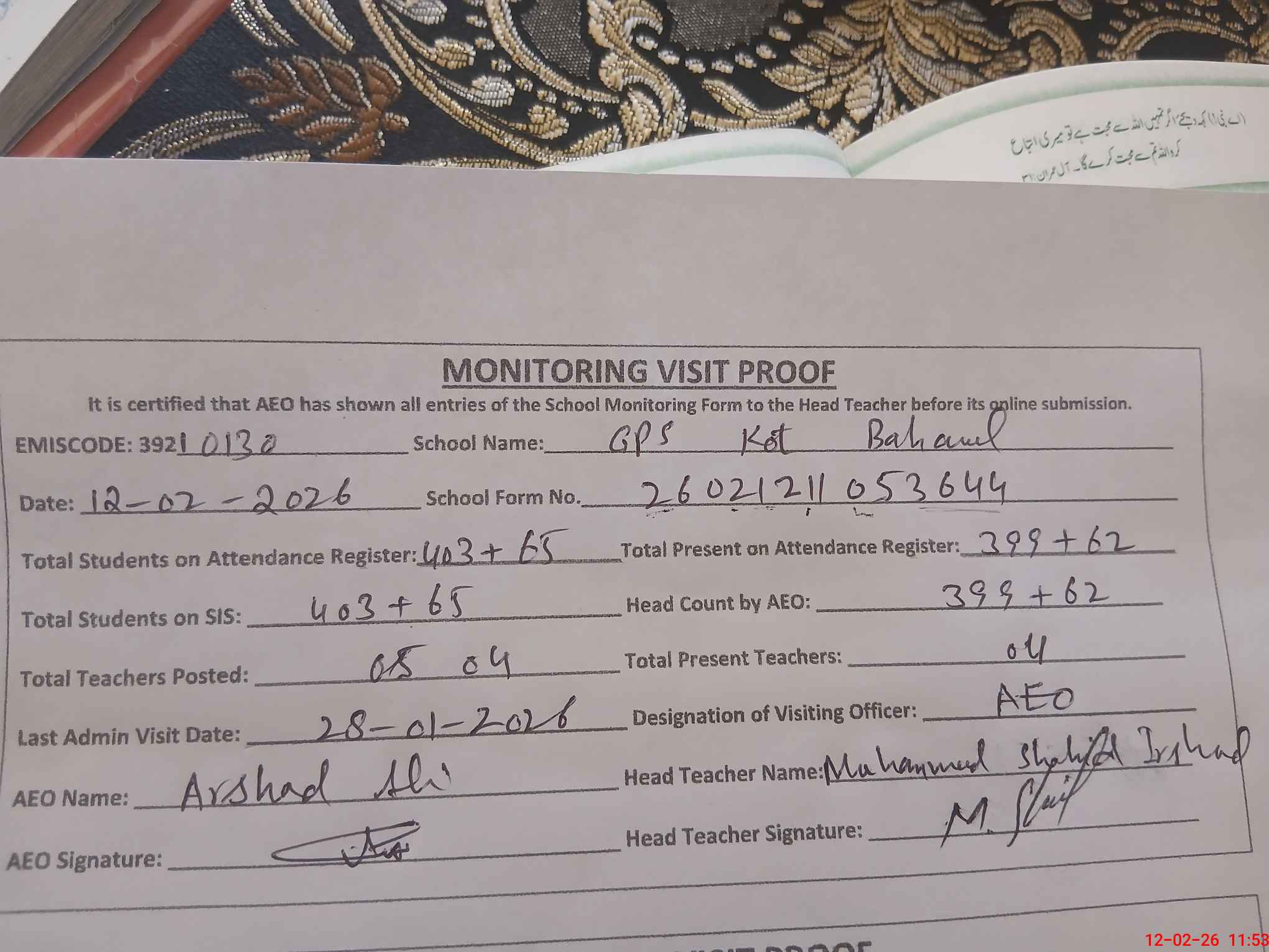 | EMIS Code: 39210130 | Name of School: GPS KOT BAHAWAL | |||