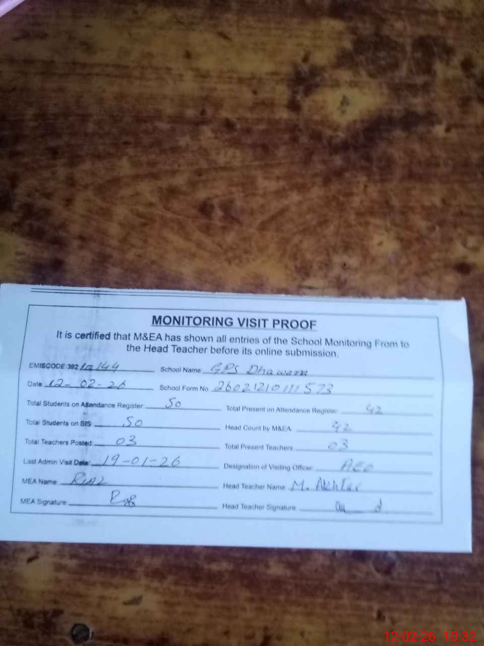 | Attendance Register | Head Teacher | MEA with School | Visit Proof |