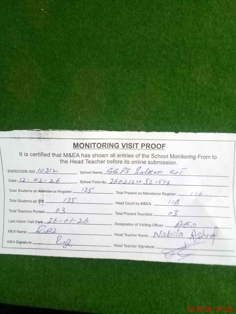 | EMIS Code: 39210312 | Name of School: GGPS SALEEM KOT | |||
