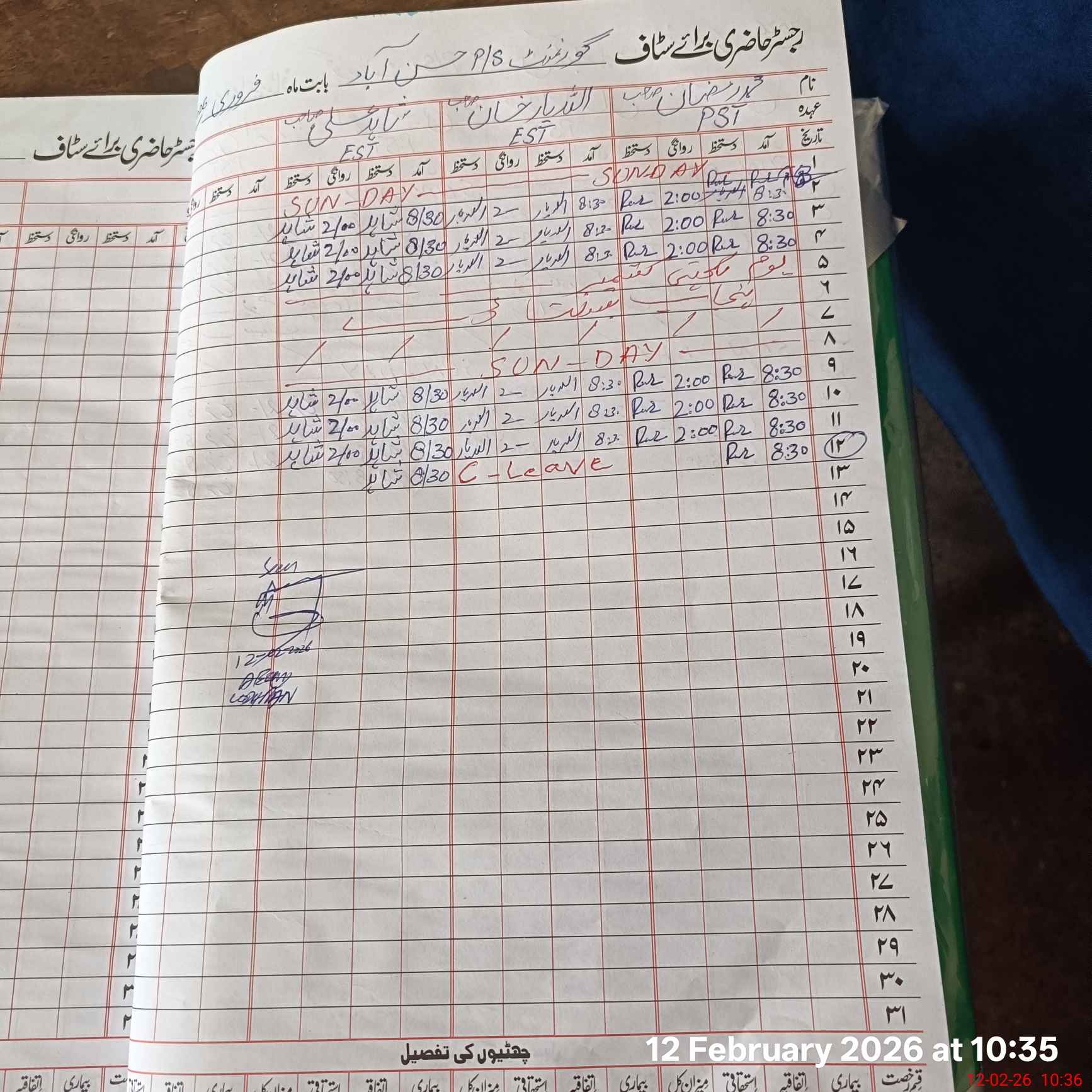 | CNIC | Full Name | Designation | R/C | Absence During Last Calender Month |