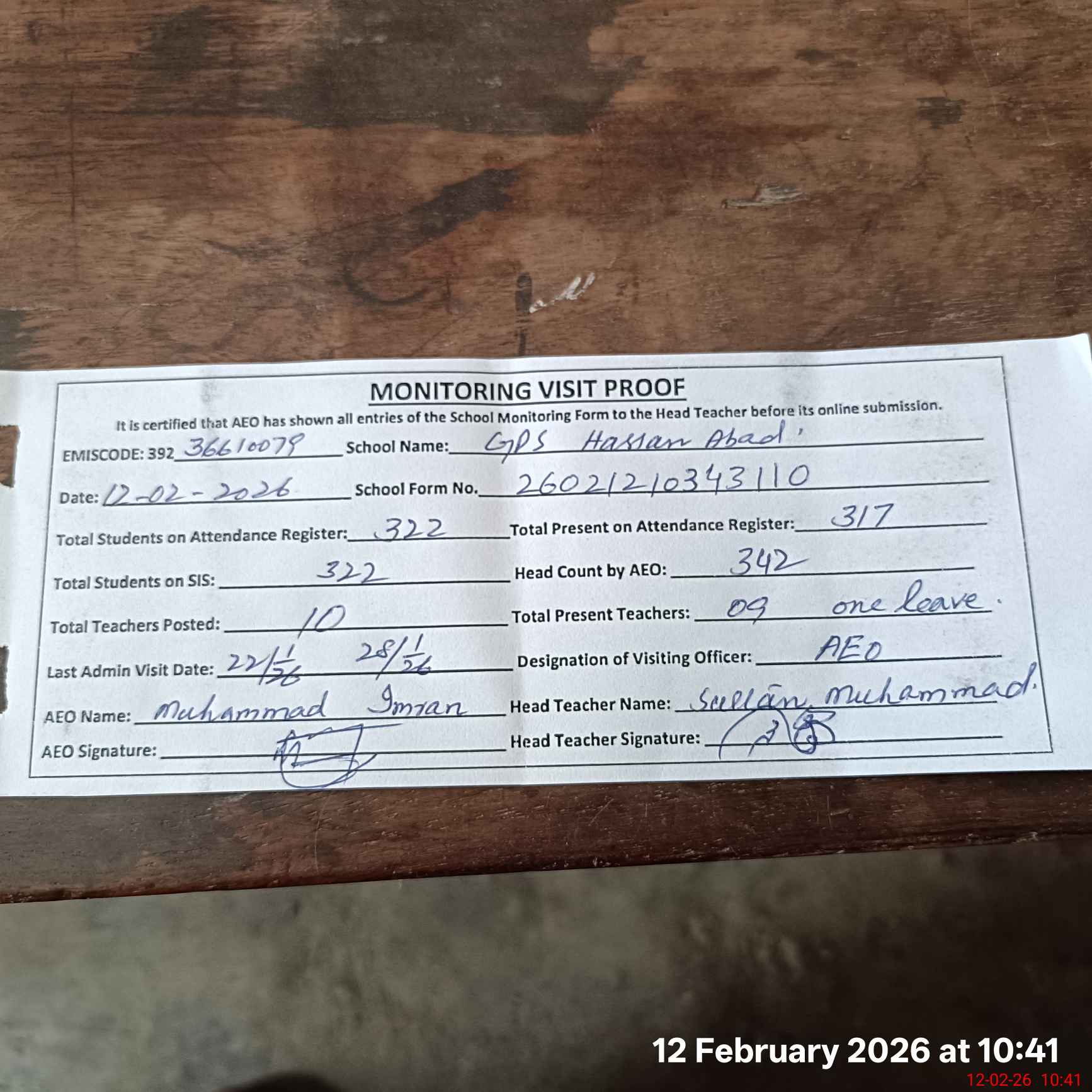 | Attendance Register | Head Teacher | MEA with School | Visit Proof |