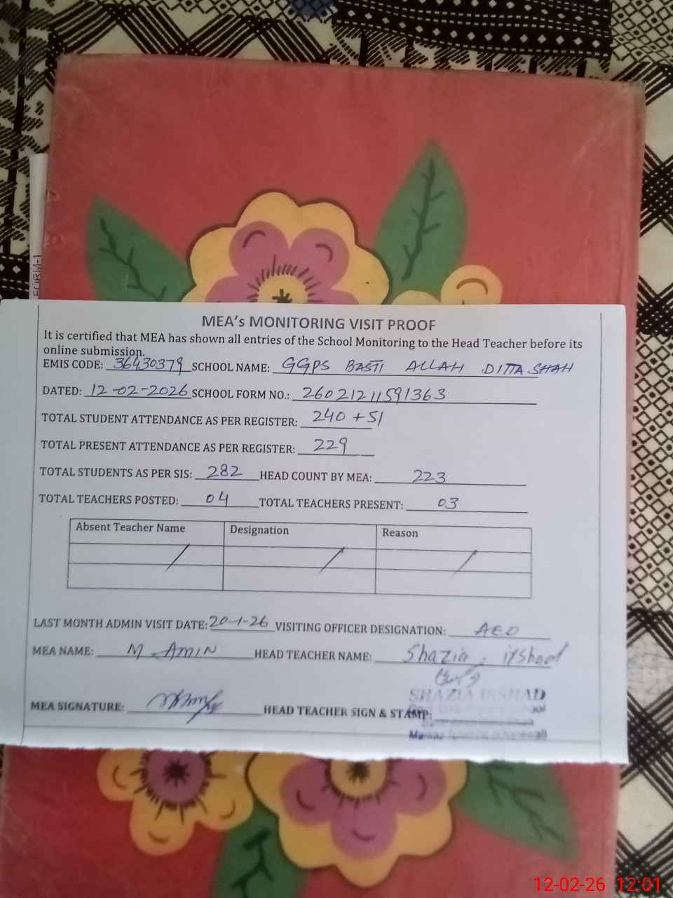 | Attendance Register | Head Teacher | MEA with School | Visit Proof |