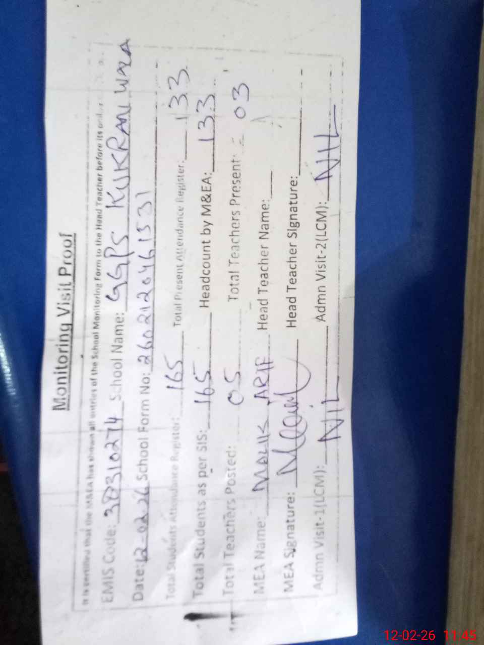 | Attendance Register | Head Teacher | MEA with School | Visit Proof |