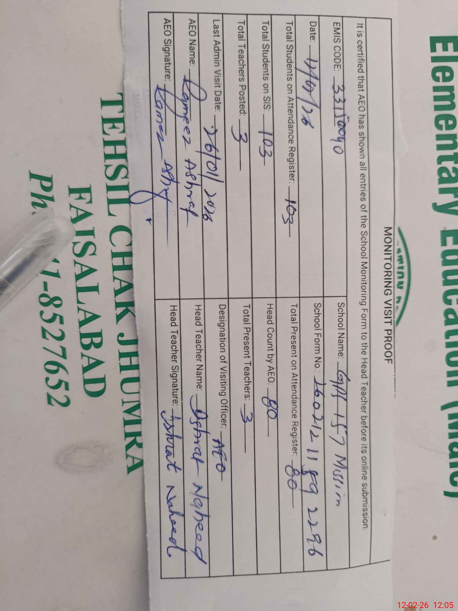 | Name: MU**** SA**** Designation: (School Headmaster's/Headmistress's) PTC Phone/Cell Number: 03**** |