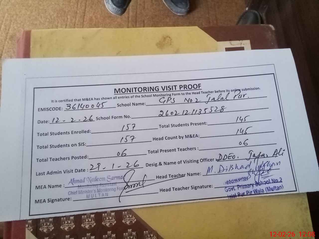 | Attendance Register | Head Teacher | MEA with School | Visit Proof |