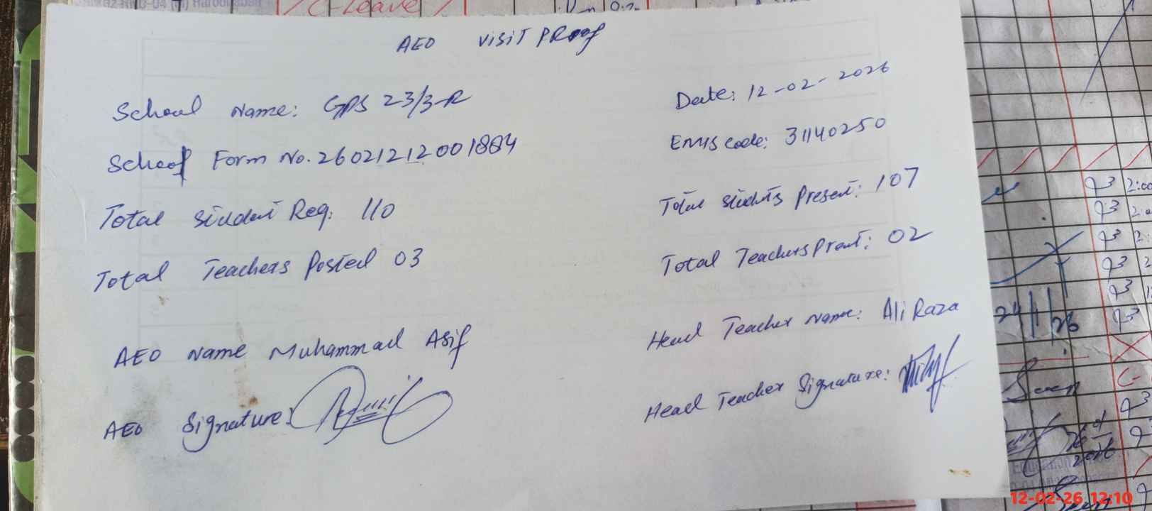 | EMIS Code: 31140250 | Name of School: GPS CHAK NO 23/3-R | |||