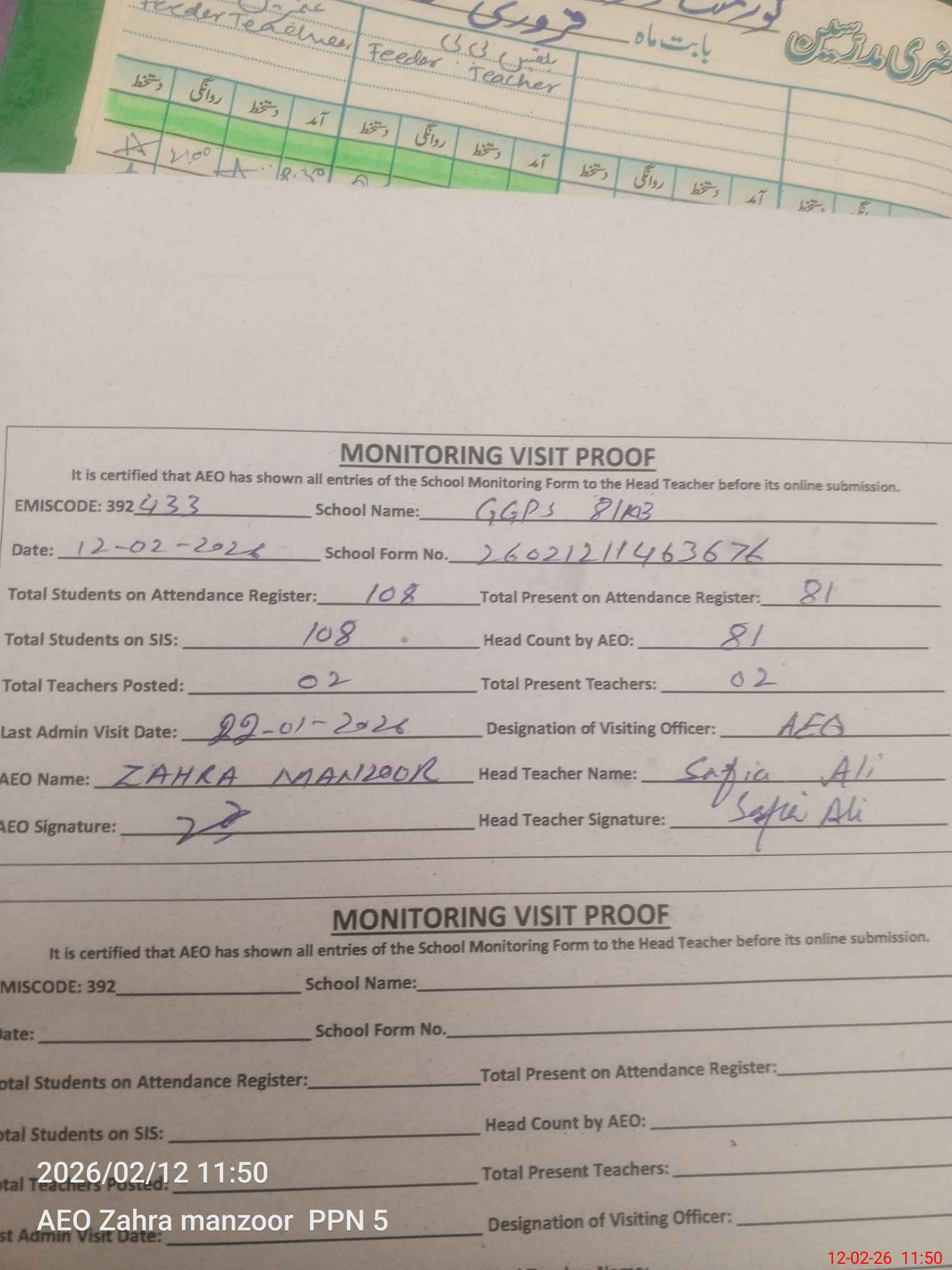 | Attendance Register | Head Teacher | MEA with School | Visit Proof |