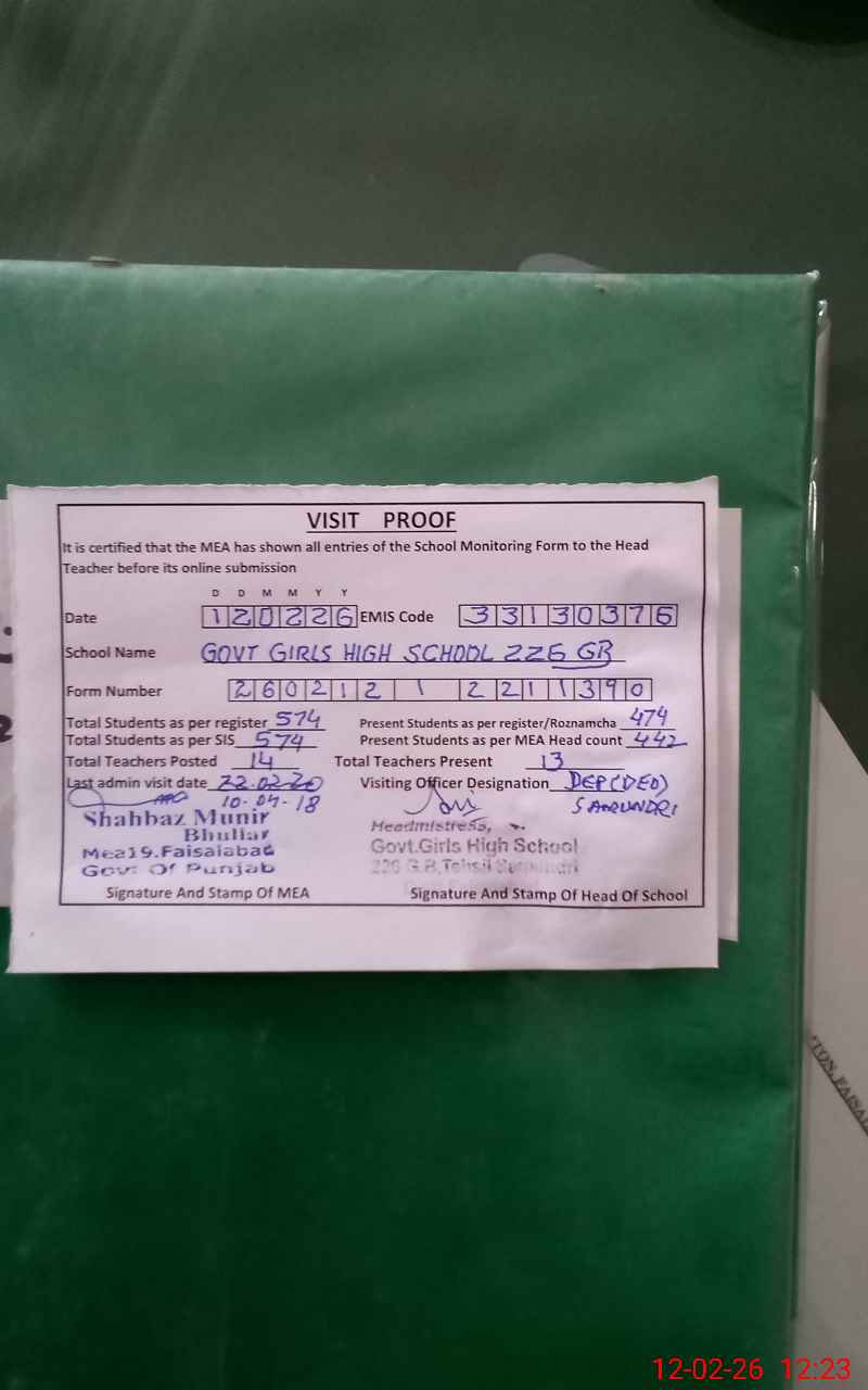 | EMIS Code: 33130376 | Name of School: GGHS CHAK NO 226 GB | |||