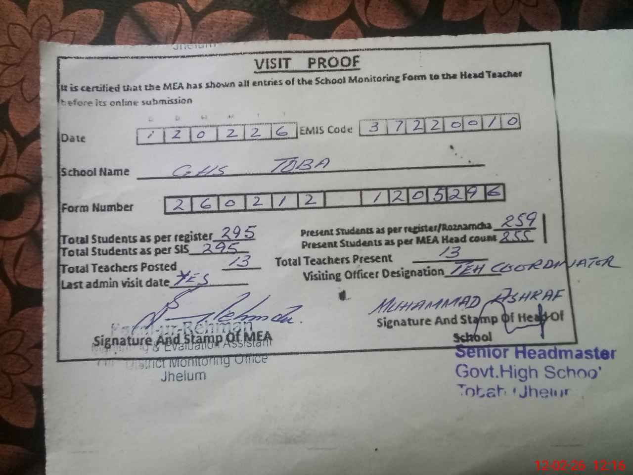 | Certified that this School was Inspected by the Undersigned MEA/DMO Today and the Information Stated Above is as Per Record. | |||||