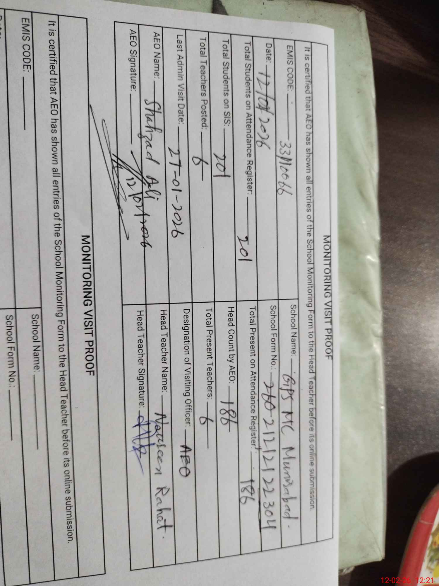 | Attendance Register | Head Teacher | MEA with School | Visit Proof |