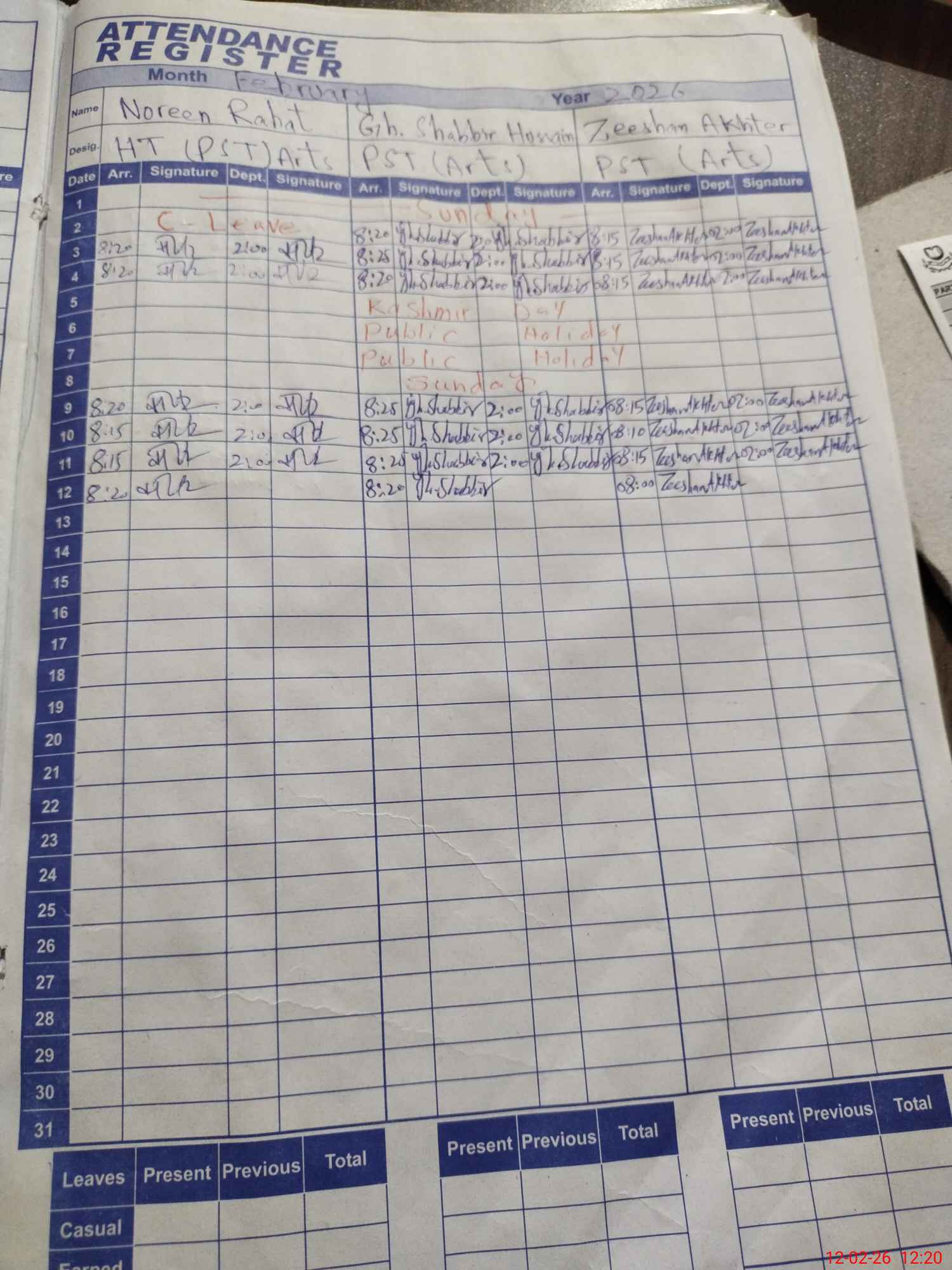 | CNIC | Full Name | Designation | R/C | Absence During Last Calender Month |