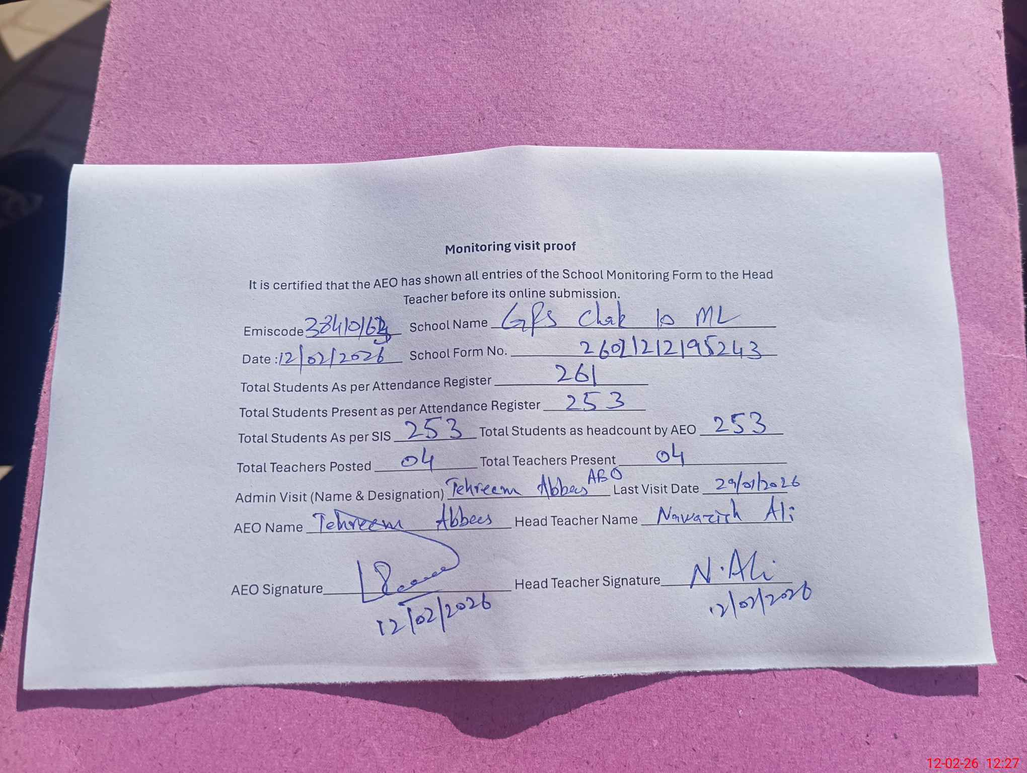 | Attendance Register | Head Teacher | MEA with School | Visit Proof |