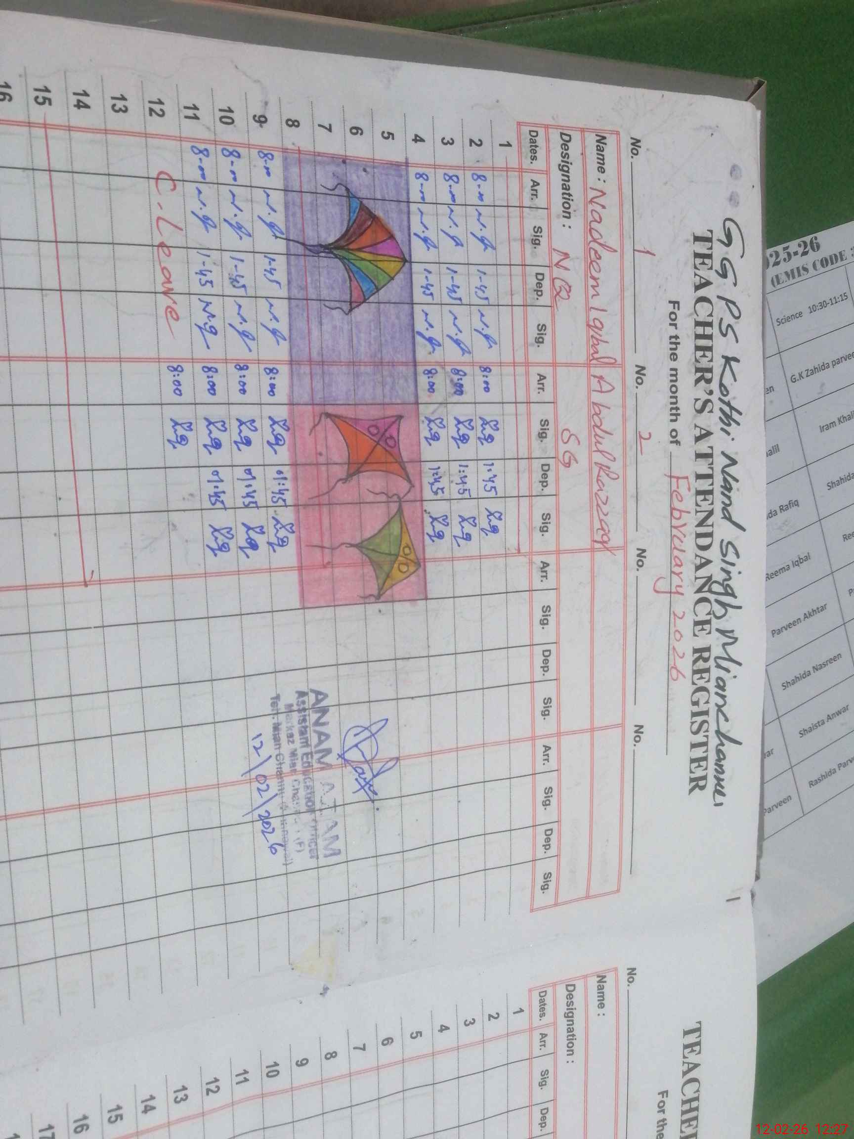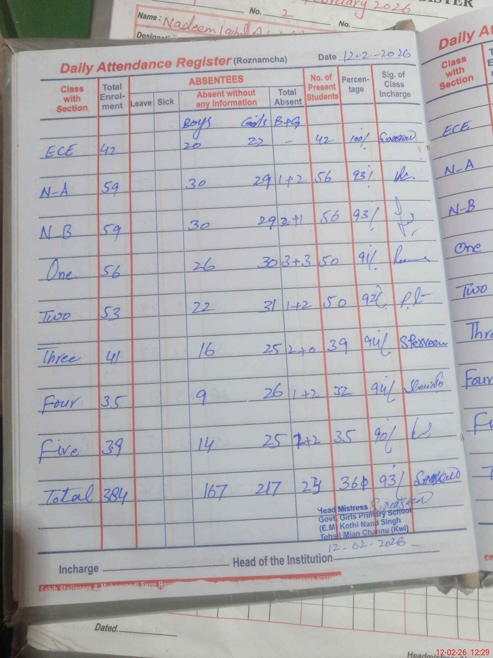 | Attendance Register | Head Teacher | MEA with School | Visit Proof |