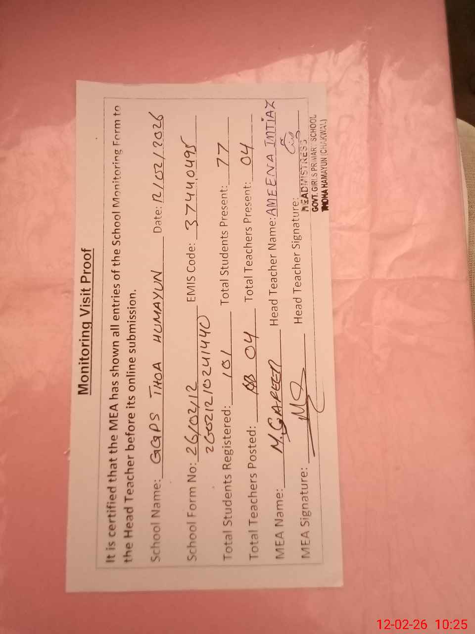 | EMIS Code: 37440495 | Name of School: GGPS THOA HUMAUN | |||