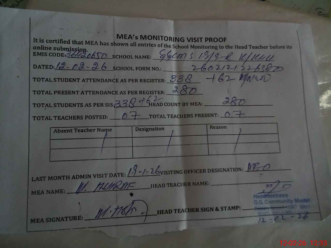 | Attendance Register | Head Teacher | MEA with School | Visit Proof |