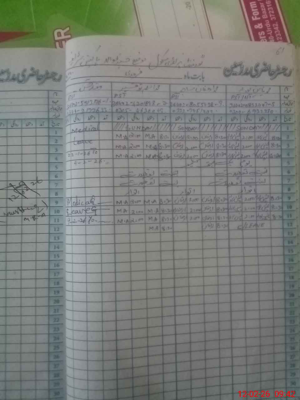 | Leave | Duty | Absent | Maternity | Medical | Ex- Pak |