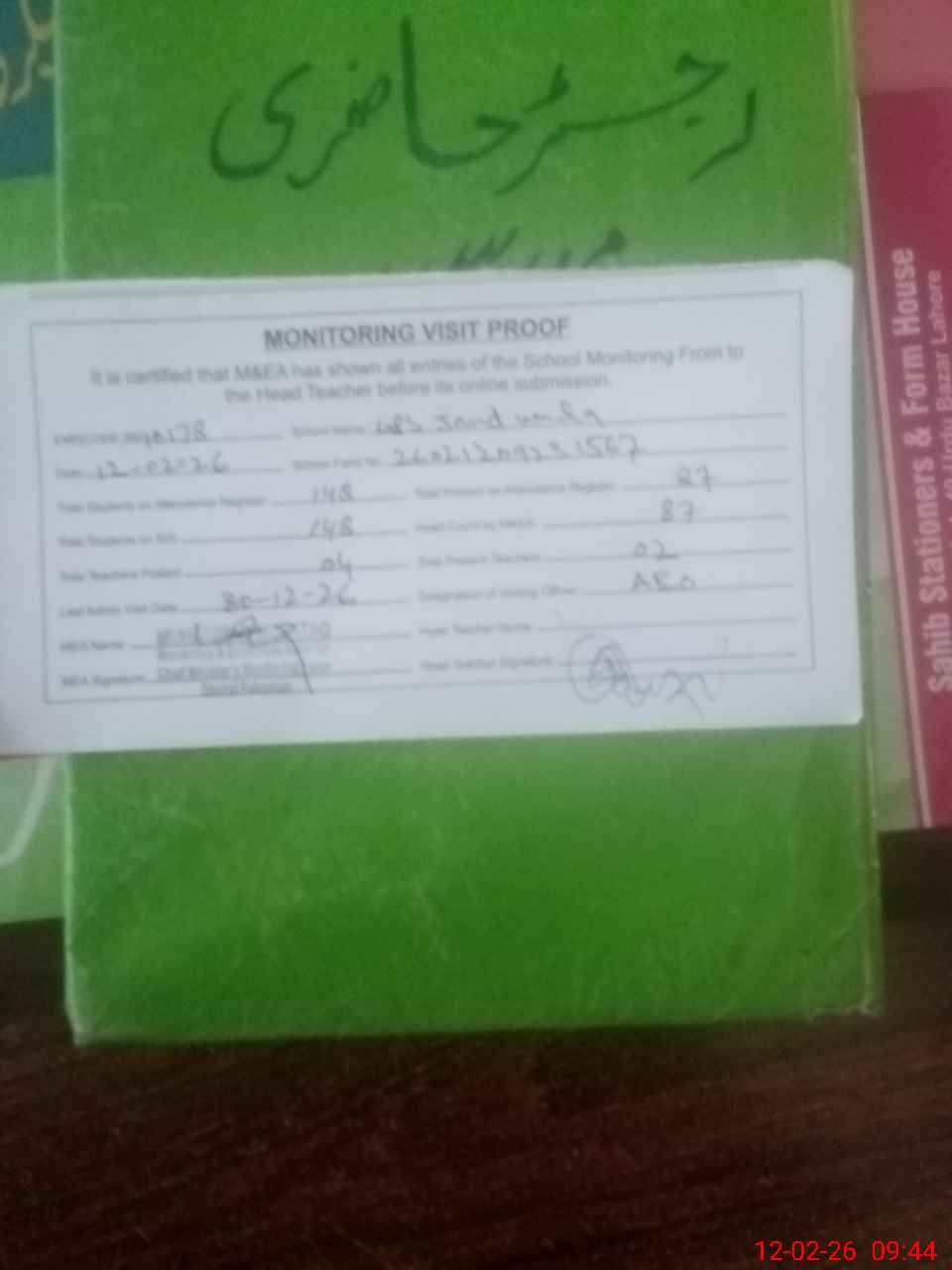 | Attendance Register | Head Teacher | MEA with School | Visit Proof |