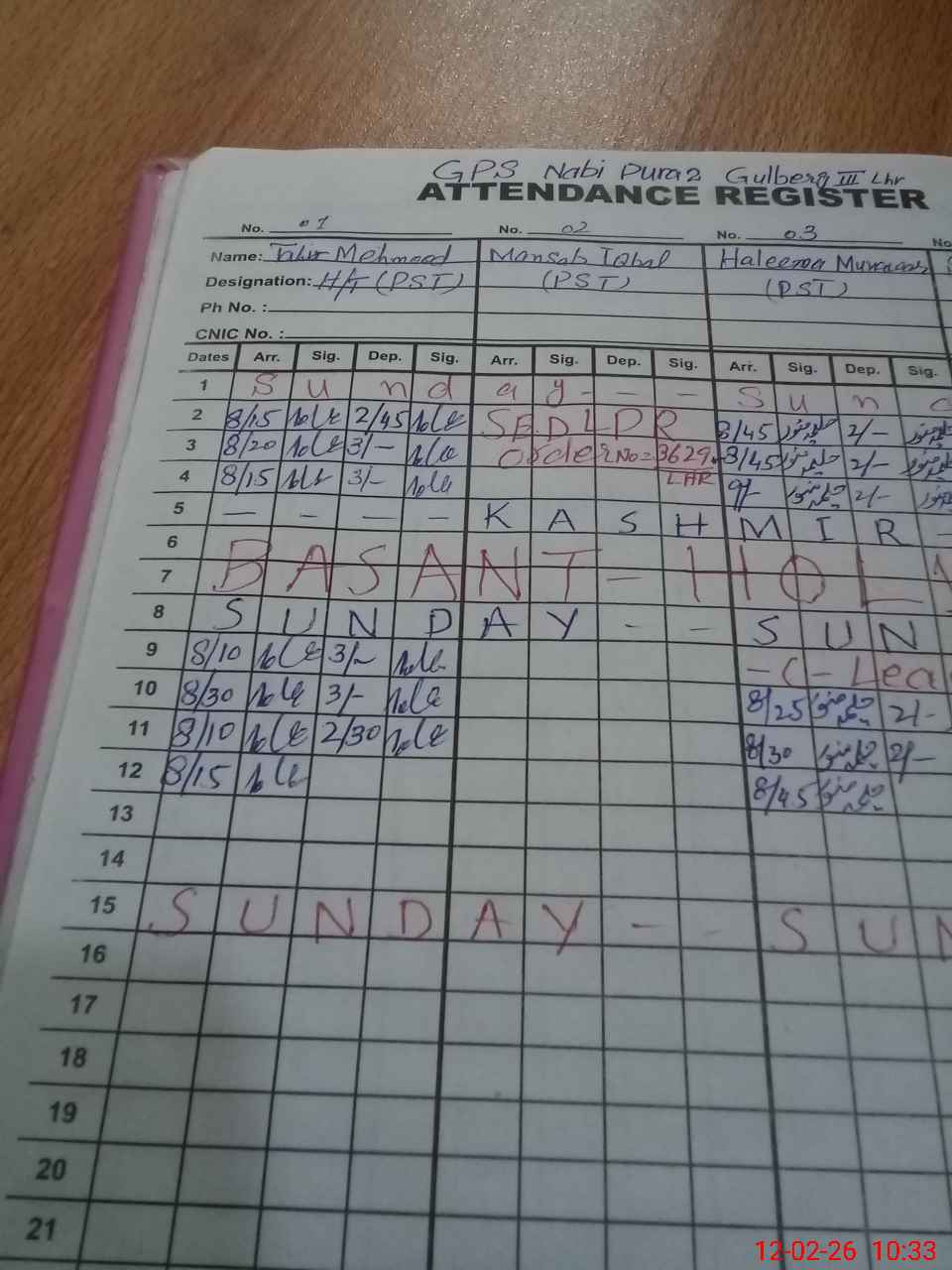 | CNIC | Full Name | Designation | R/C | Absence During Last Calender Month |