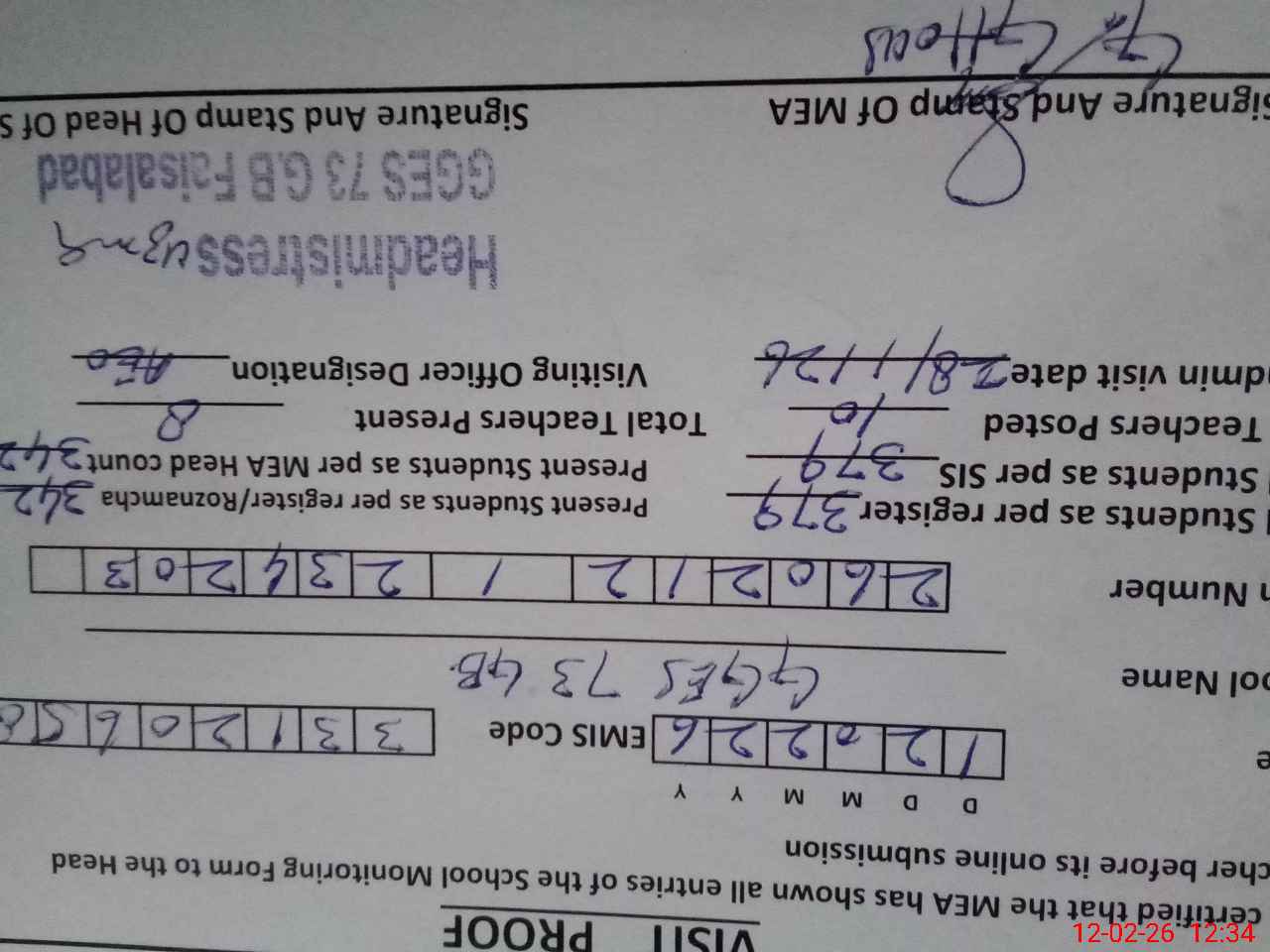 | EMIS Code: 33120658 | Name of School: GGES CHAK 73 GB SATIANA | |||