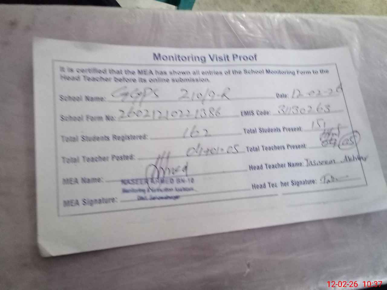 | Attendance Register | Head Teacher | MEA with School | Visit Proof |