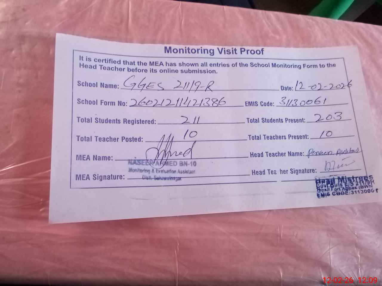 | Attendance Register | Head Teacher | MEA with School | Visit Proof |