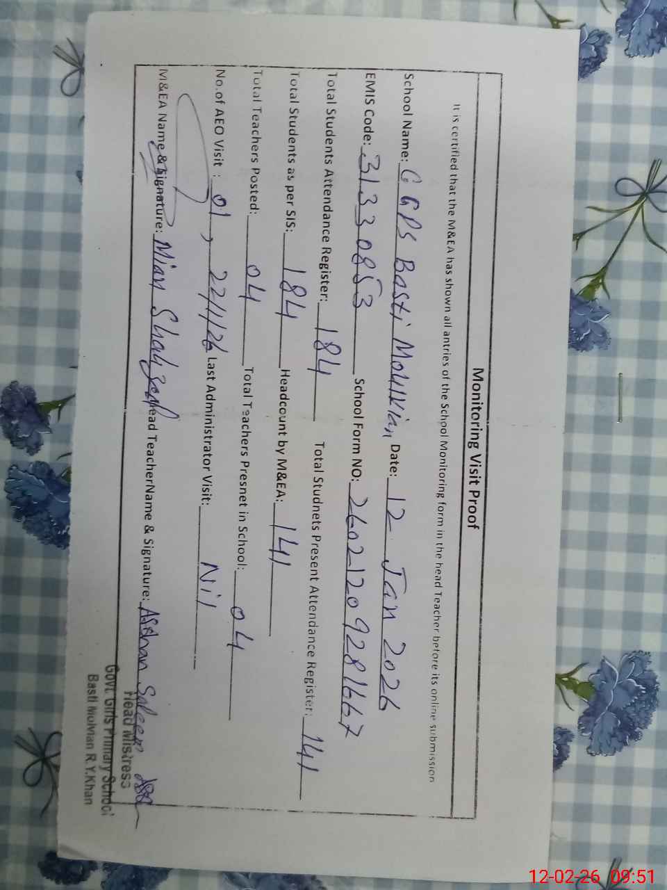 | Attendance Register | Head Teacher | MEA with School | Visit Proof |