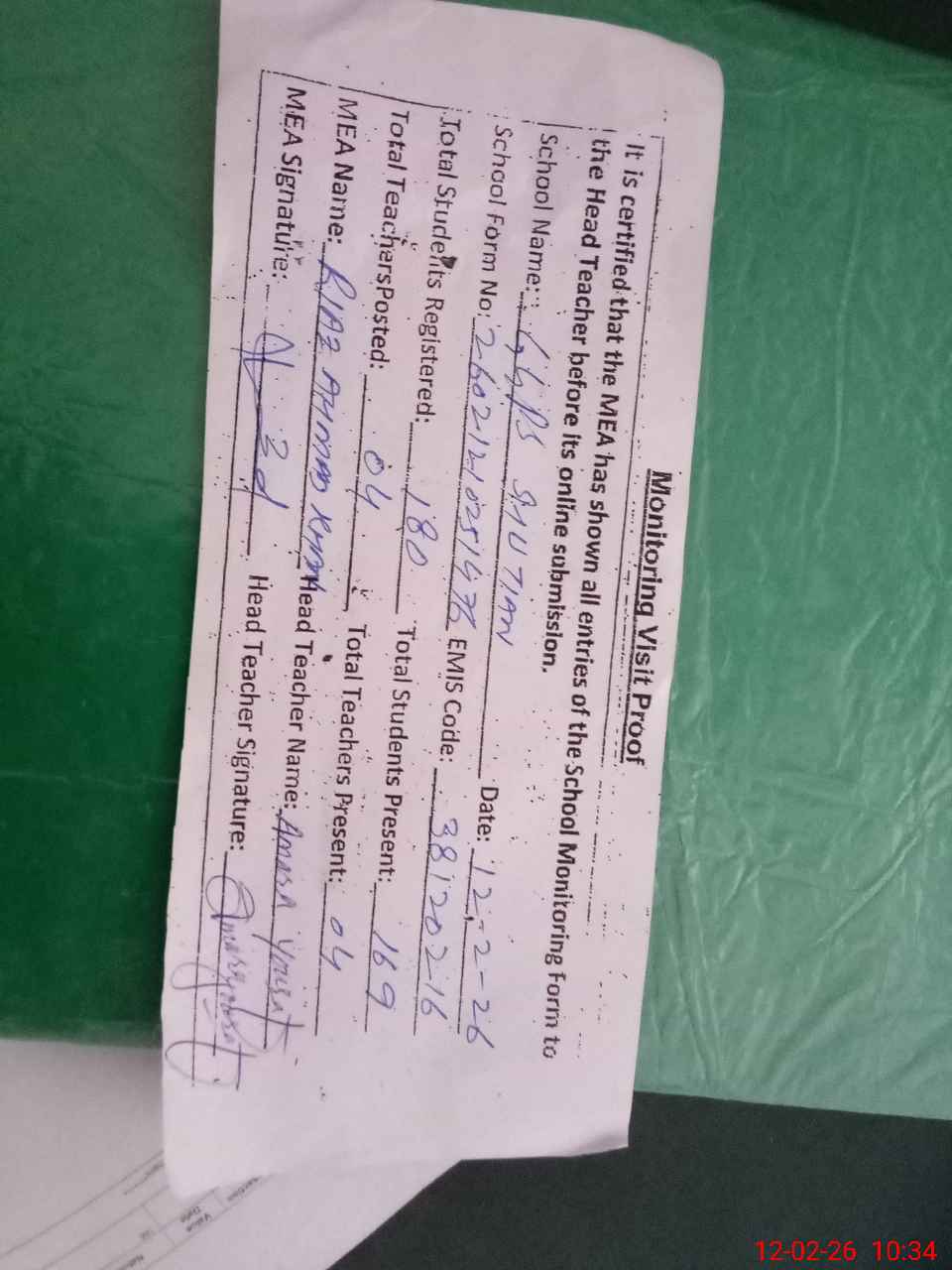 | Attendance Register | Head Teacher | MEA with School | Visit Proof |