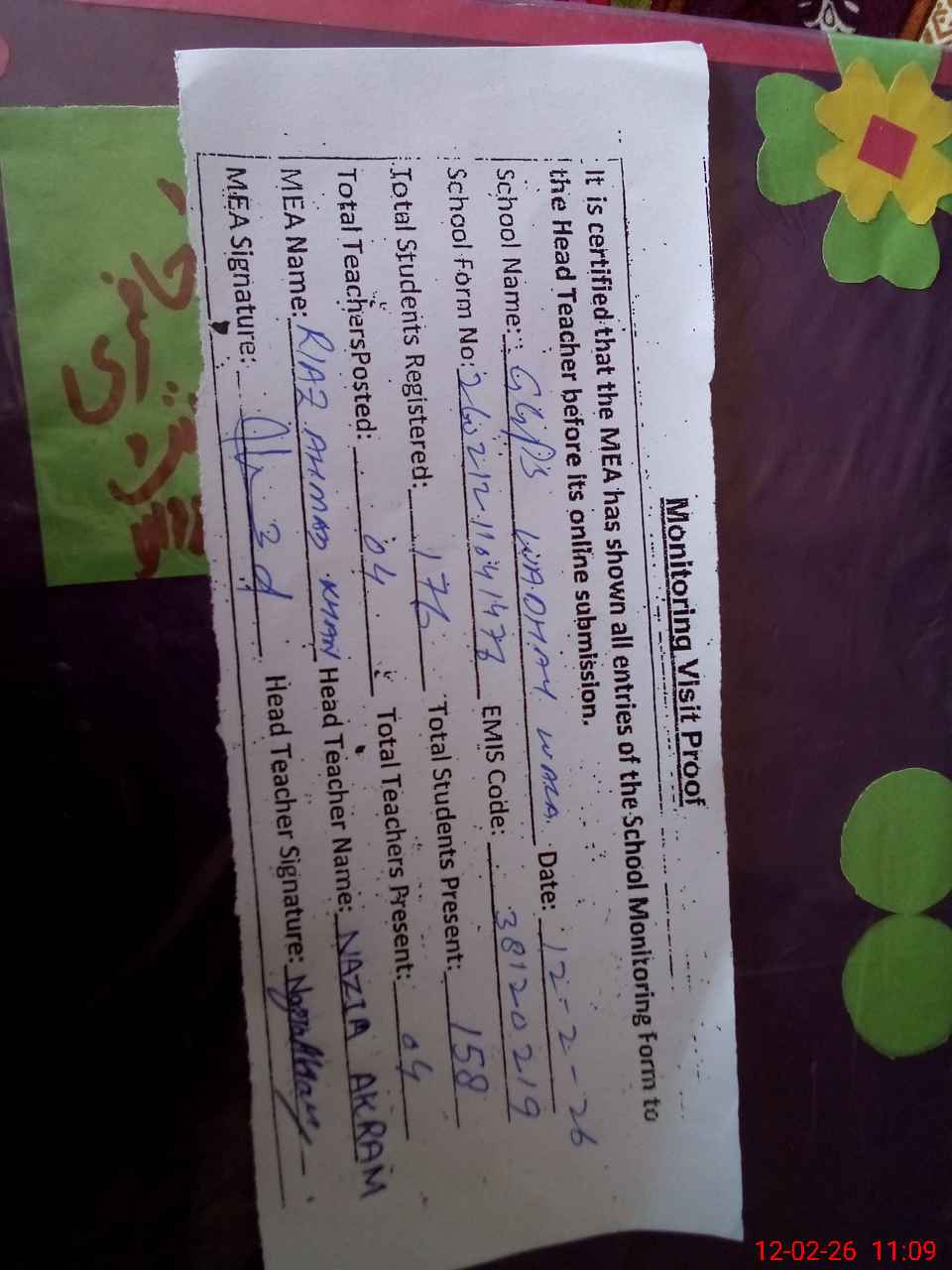 | Attendance Register | Head Teacher | MEA with School | Visit Proof |